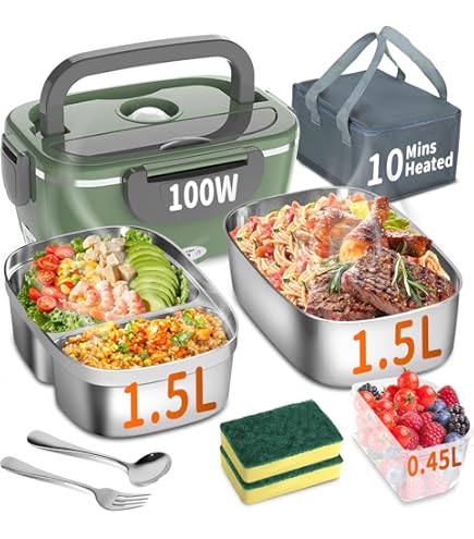 🍤 【TECHNOLOGIE DE CHAUFFAGE】Utilisation d'un chauffage à température constante original PTC, cycle de chaleur à faible consommation pour maintenir les aliments à une température appropriée, sûre et rapide. (Si les aliments ont été sortis du réfrigérateur ou dans une température ambiante basse, le temps de chauffage doit être prolongé de manière appropriée). Fréquence: 50HZ-60HZ Contient un récipient amovible en acier inoxydable de 1,5L, ils sont lavables au lave-vaisselle. 🚛 【LISTE DES PAQUETS】Le réchauffeur électrique de boîte à lunch comprend : 1x boîte à lunch électrique (23,8x17x10,8cm) ; 1x boîte intérieure en acier inoxydable 304 (1,5L) ; 1x cuillère et fourchette en acier inoxydable ; 1x sac de transport isolé pour le déjeuner ; 1x anneau d'étanchéité étanche ; 1x cordon d'alimentation 12V/24V pour les voitures/camions, 1x 110V pour la maison/bureau. N'ajoutez pas d'eau à la base chauffante pour éviter les courts-circuits). Satisfaction à 100%: Notre magasin insiste toujours sur le principe Le client d'abord. Notre boîte à lunch électrique est livrée avec un contenant lavable qui est facile à nettoyer. Boîte à lunch chauffante boîte à lunch électrique portable 40 W 2 en 1... Ne pas tourner la lunchbox à l'envers pour éviter les fuites de liquide par le port de vapeur sur le couvercle. 🚚 【MATÉRIAU SÛR ET FACILE À NETTOYER】Boîte à lunch chauffante portable fabriquée en plastique PP de qualité supérieure et en acier inoxydable 304, ce qui est sûr et durable. Couleur: Gris/Gris clair , Capacité: 1., 5L , Puissance: 50W-65W Boîte Chauffante Repas Lunch Box Électrique 12V 24V 220V 3 in1 40W Amovible en Acier Inoxydable Par conséquent, si vous avez un problème ou une question, veuillez d'abord nous en faire part, nous vous donnerons une solution satisfaisante. Cadeau idéal pour famille, votre amoureux et vos amis à l'occasion d'un anniversaire, fête ou de Noël. Poignée pratique Que ce soit au bureau ou à l'extérieur, la poignée permet de sortir ou de transporter facilement le sac. (Conseils pratiques : Ne pas nettoyer la base chauffante avec de l'eau. 🚖 【2 EN 1 POUR LA VOITURE ET LA MAISON】La lunch box chauffante électrique contient deux prises différentes : Travail/Maison (110V) et Voiture/Camion (12V/24V). BUTY-Tbest boîte à lunch électrique pour la maison 15L Isolation... Lunch Box Chauffante 1.5L Lunch Box Gamelle Chauffante Électrique Pour Voiture Camion Bureau Travail 220V+12V+24V, Acier Réchauffeur Portable Sac Isotherme Cliquez sur ACHETER MAINTENANT et obtenez notre boîte à lunch électrique immédiatement. Le couvercle ne bougera pas pendant l'utilisation, plus hermétiquement couvert. Parfait pour l'école, le bureau ou le camion.