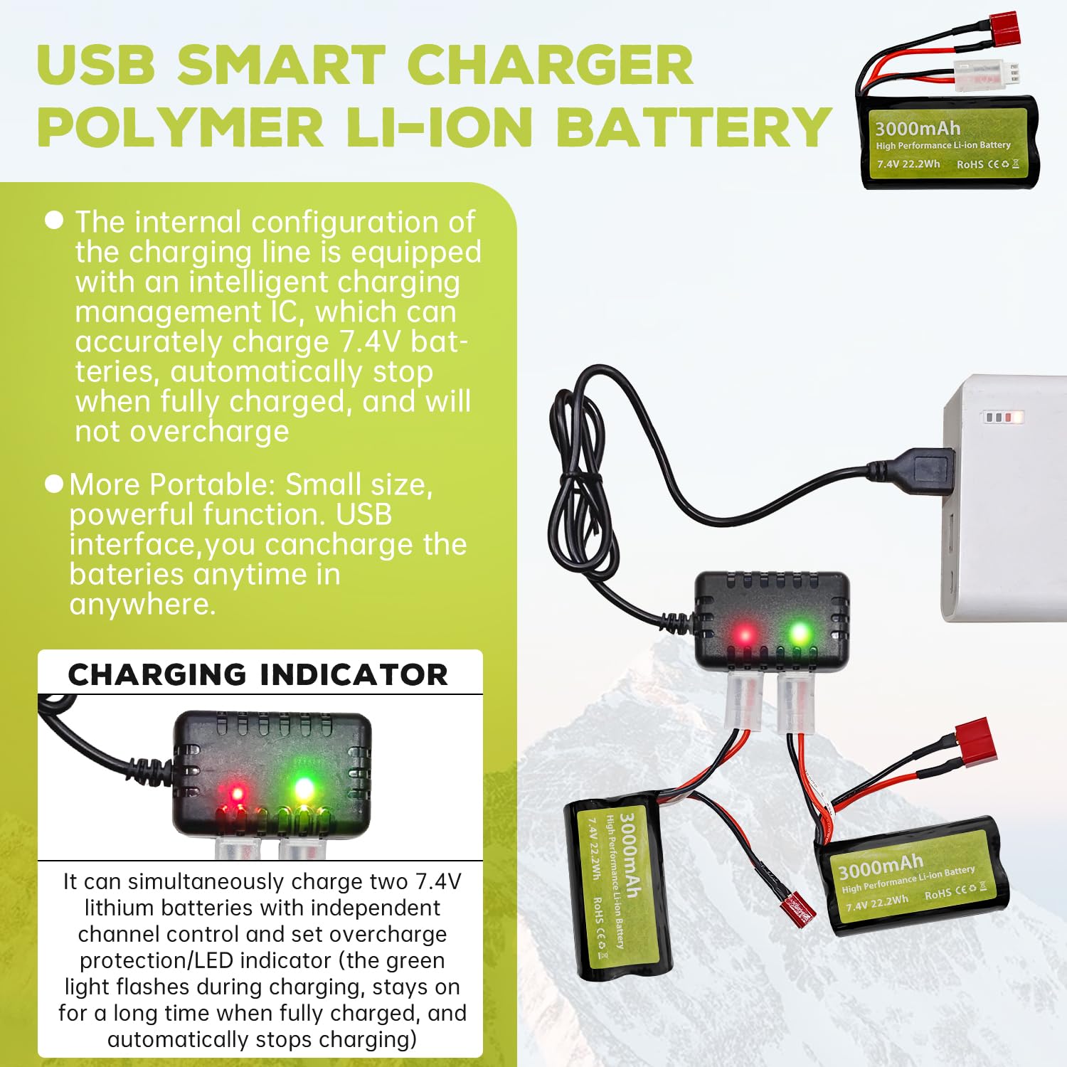 Une utilisation incorrecte, telle qu'un court-circuit ou une surcharge, peut entraîner une explosion ou un incendie. Cette batterie est compatible avec la plupart des voitures RC, voitures RC jouets, voitures RC cascades., Camions RC., Buggy à grande vitesse. Batterie de voiture électrique. Ne pas enflammer la batterie., 5., Ne pas surcharger la batterie. Batterie de bateau RC, batterie de drone RC. Principaux points forts ; Nombre de batteries. 2 Lithium-polymère nécessite des piles. ; Marque. ZYGY ; Capacité de la batterie. 3000 Milliampères-heure (mAh Instructions de charge: deux batteries au lithium 7,4V chargées simultanément, contrôle de canal indépendant, réglage de la protection contre la surcharge / indicateur LED (le feu vert clignote lors de la charge, le feu vert s'allume lorsque la charge est complète, la charge s'arrête automatiquement) protection contre la surcharge/indicateur LED Description du produit Remarque : Veuillez vérifier que la taille de la batterie et la prise conviennent à votre appareil RC avant d'acheter, car les compartiments de la batterie diffèrent d'un jouet à l'autre ! Chargeur 2 En 1 Rc ZYGY 2PCS 7.4V 3000mAh 15C 2S Batterie Li-ION Prise T Et Chargeur 2 En 1 Pour WLtoys 12423 MJX14301 14302 14303 H16PL Véhicules à Télécommande à Grande Vitesse 1/10, 1/12, 1/16 Télécommande Véhicules Batterie Voiture Rc ZYGY 2PCS 7.4V 850Ah Lithiu Batterie 2in1 Ladegerät für 9300 9301E... La batterie ne pèse que 100grammes/1 PCS, la taille de la batterie est de 70 * 37 * 19 mm (2,75 * 1,45 * 0,74 pouces), il est très léger et facile à transporter, note: vérifiez la prise et la taille de votre batterie de jouet RC avant de commander la batterie. Paramètres de sortie: DC 7., 4V 2X1000mA Présentation du chargeur Nom du produit: Chargeur intelligent USB (1 chargeur de traîneau 2) Le paquet comprend: 2PCS 7., 4V 3000mAh 15C 2S Batterie Li-ion prise T et Chargeur 2 en 1 ZYGY 2PCS 7.4V 3000mAh 15C 2S Battery T Socket and Charger 2 Pour WLtoys 12423 MJX 14301 14302 14303 H16PL Télécommande à grande vitesse 1/10, 1/12, 1/16 Télécommande proportionnelle Véhicule Véhicule de construction Véhicule Seules la tension, la taille et la prise peuvent être installées. Informations sur la batterie : Batterie de quadcoptère