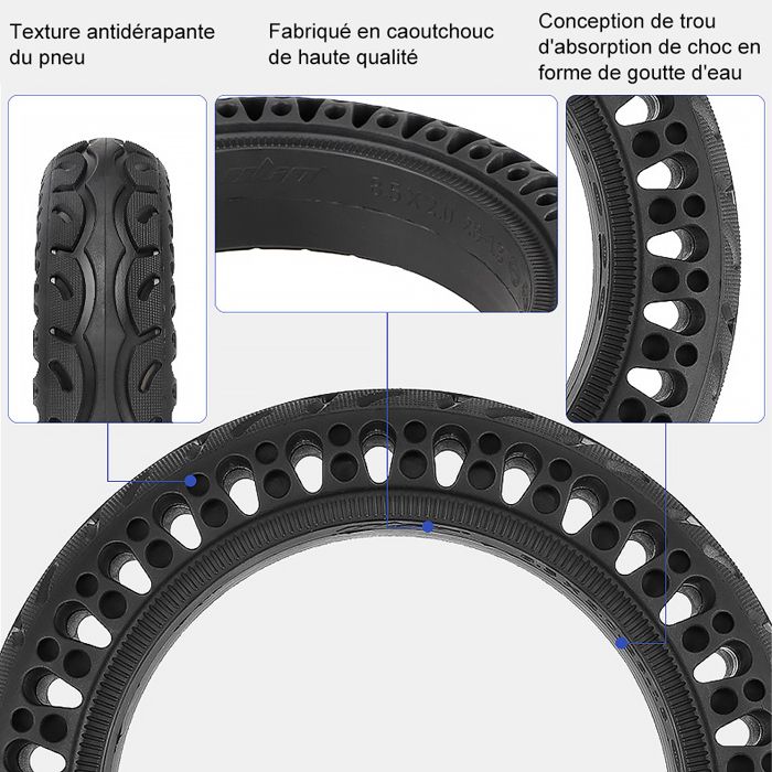 【EXCELLENT MATÉRIAU】: Les pneus pleins Ainiv sont fabriqués à partir de caoutchouc naturel de haute qualité. Roue Alveolée Dure Anti Crevaison Anti dérapant Increvable Solide 8,5 Pouces Avant/Arrière · caoutchouc · 4,54,5 sur 5 étoiles (1,1 k) · 12,59 €12,59€Conseillé... Une excellente force d'amortissement et une excellente élasticité assurent une meilleure résistance aux chocs et un effet de décompression. (Si vous êtes dans une zone froide, vous devrez utiliser de l'eau complètement bouillante pour ramollir les pneus. Pneu Anti Crevaison M365 Pro Ainiv Pneu Plein Pour Xiaomi M365, 2 Pneus De Rechange De 8,5 Roue Trottinette Electrique 【SÛR ET FIABLE】 : Pas besoin de chambre à air et pas besoin de gonfler, éliminant ainsi le risque de crevaison pour vous. Êtes-vous fatigué des réparations constantes de pneus en raison de problèmes de crevaison? Les pneus pleins Ainiv vous aident à vous débarrasser de ces problèmes ! Non toxique, inodore et ne se décolore pas. 【LARGE APPLICATION】: Ce pneu solide convient aux pneus avant et arrière de scooter électrique avec un diamètre de pneu de 8,5 pouces. Principalement utilisé pour le scooter électrique Xiaomi Mijia M365/M365 pro. Modèle : 8,5Matériel: CaoutchoucDiamètre intérieur : 14 cmDiamètre extérieur : 21 cmMatériau du pied de biche : alliage d'aluminiumContenu : 1 pneu solide + 1 pied Étapes d'installation :1., Trempez le pneu dans de l'eau à 80-100℃ pendant 10-20 minutes avant l'installation. (Évitez d'utiliser des lubrifiants avec de la graisse, ce qui endommagerait les pneus., )3., Placez chaque côté du pneu sur la jante et appuyez sur ce côté., 4., Utilisez un pied-de-biche pour pousser l'intérieur du trou du pneu jusqu'à la jante., 5., Avec les pneus et les moyeux entièrement connectés, retirez le pied de biche et laissez-le là pendant environ une heure jusqu'à ce qu'il refroidisse complètement avant de conduire., Avis :1., Nos pneus pleins ne conviennent qu'aux pneus de scooter électrique d'un diamètre de 8,5 pouces, veuillez confirmer la taille avant d'acheter., 2., Si vous ne comprenez pas parfaitement la méthode d'installation, demandez à un professionnel du magasin de l'installer pour vous. Pneu plein Xiaomi m365-Pro,2,3- 1S – Essential Résistance à la compression et à l'usure, plus durable que les pneus traditionnels ! Convient également aux modèles de la série Cecotec/Gotrax/Ducati de 8,5 pouces., ., ., (veuillez vérifier la taille de vos pneus avant d'acheter) 2xPneu Plein pour Xiaomi Trottinette M365/Pro/Pro2, Dure Anti Crevaison