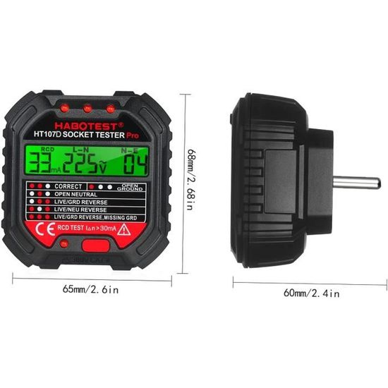 Tension de fonctionnement: 90-250 V 45-65 Hz Plage de mesure de tension de phase: 90 ~ 250V 45 ~ 65Hz Précision: ± (2,0% + 2) Plage de mesure de tension de fuite: 0 ~ 99V / 45 ~ 65Hz Précision: ± (2., 0% + 2) Température de fonctionnement: 0 ° C ~ 40 ° C Humidité de travail: 20% ~ 75% HR Température de stockage: -10 ° C ~ 50 ° C Humidité de stockage: 20% ~ 80% HR Altitude: ≤2000 m Courant du disjoncteur différentiel: 30 mA Tension de fonctionnement du RCD: 220 V ± 20 V Prise UE HT107D - Testeur de prise de courant numérique, Détecteur de... 【INDICATE STATUS FACILE À LIRE】 - 7 modes d'éclairage LED, il existe 7 types d'indicateurs faciles à lire pour indiquer l'état de La prise, faciles à juger. Lorsque le mauvais câblage est détecté, veuillez trouver un électricien professionnel pour réparer le câblage. Testeur Terre Prise UE HT107D - Testeur De Prise De Courant Ht107 Pro, Testeur De Appareil Test Prise Domestique Professionnel Il peut tester le système de protection pour assurer La sécurité électrique domestique Liste des packages: 1 x testeur de prise 【ASSUREZ La SÉCURITÉ ÉLECTRIQUE】 - Avec l'écran LCD, il peut mesurer La fréquence, La tension de phase (L_N) et La tension de fuite (N_E) rapidement et avec précision. 【LARGEMENT UTILISÉ DANS LE PORTÉE ÉLECTRIQUE testing - Largement utilisé dans les tests de maintenance électrique dans les écoles, les laboratoires, les usines et autres domaines sociaux, les tests de prises de bureaux, les tests de barrettes d'alimentation et les tests de prises murales. Cela peut gagner beaucoup de temps pour tester les problèmes de socket Observez ensuite l'indicateur et le tableau de comparaison des fonctions pour déterminer quel type de câblage de La prise est incorrect, puis débranchez le testeur. Spécification: Condition: 100% tout neuf Type d'élément: Testeur de socket Matériau: ABS Fonctions principales: détection de séquence de fils de prise à trois broches, détection de tension de phase (L_N), détection de tension de fuite (N_E), détection de commutateur de fuite (RCD). À propos de cet article [DÉTECTION RAPIDE] Il peut tester le système de protection pour assurer sécurité électrique à maison. [AVEC ÉCRAN LCD] Il peut mesurer fréquence, tension de phase (L_N) et tension de fuite (N_E) rapidement et avec précision 1 x manuel d'instructions Testeur de prise pour détecter rapidement si La connexion du fil de La prise est correcte ou non. Testeur Electrique GOTOTOP Testeur De Sortie HT107D LCD Testeur De