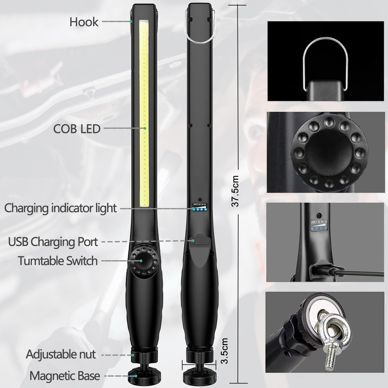 Lampe Magnétique Crochet Pristar Mini Lampe De Travail LED Rechargeable Lampe De Poche Ultra Lampe Camping Bricolage Avec sa tête rotative à 180°, elle permet un contrôle précis de l'éclairage, rendant cette lampe idéale pour les salles de sport, les studios ou même les tentes de camping Projecteur extérieur,Lampe de poche LED magnétique avec crochet, torche Fonction banque d'alimentation : cette lampe d'extérieur rechargeable dispose d'une batterie intégrée de 1800 mAh, qui peut être utilisée pendant 3 à 4 heures après avoir été complètement chargée, et est équipée d'un port de sortie USB, qui peut être utilisé comme une banque d'alimentation, vous permettant de charger votre téléphone ou d'autres appareils lors de longs trajets. LED Magnétique Portable:La base magnétique et le crochet libèrent vos mains, fixez la lumière sur une surface métallique ou accrochez-la à un crochet avec des aimants puissants. Cette lampe de fitness légère peut être emportée partout et permet un entraînement de pose rapide et pratique, et l'éclairage peut être fixé à tout moment, n'importe où 【Facile à transporter】 Où que vous alliez, vous pouvez facilement transporter et utiliser cette lumière LED pliable, ce qui est idéal pour les amateurs de fitness en plein air et les aventuriers en plein air Réglable à 180 degrés : avec sa tête de lampe réglable à 180 degrés, vous pouvez régler l'angle selon vos besoins pour le travail de nuit, l'entretien, le camping, les voyages, etc. 【7 niveaux de gradation et quatre modes d'éclairage】Cette lampe de fitness offre 7 niveaux de gradation et quatre modes multifonctions (blanc vif, jaune chaud, rouge et clignotant) pour fournir un éclairage parfait et efficace pour n'importe quel environnement 【Lumière LED multifonction】Cette lumière LED intègre une variété de fonctions pratiques.