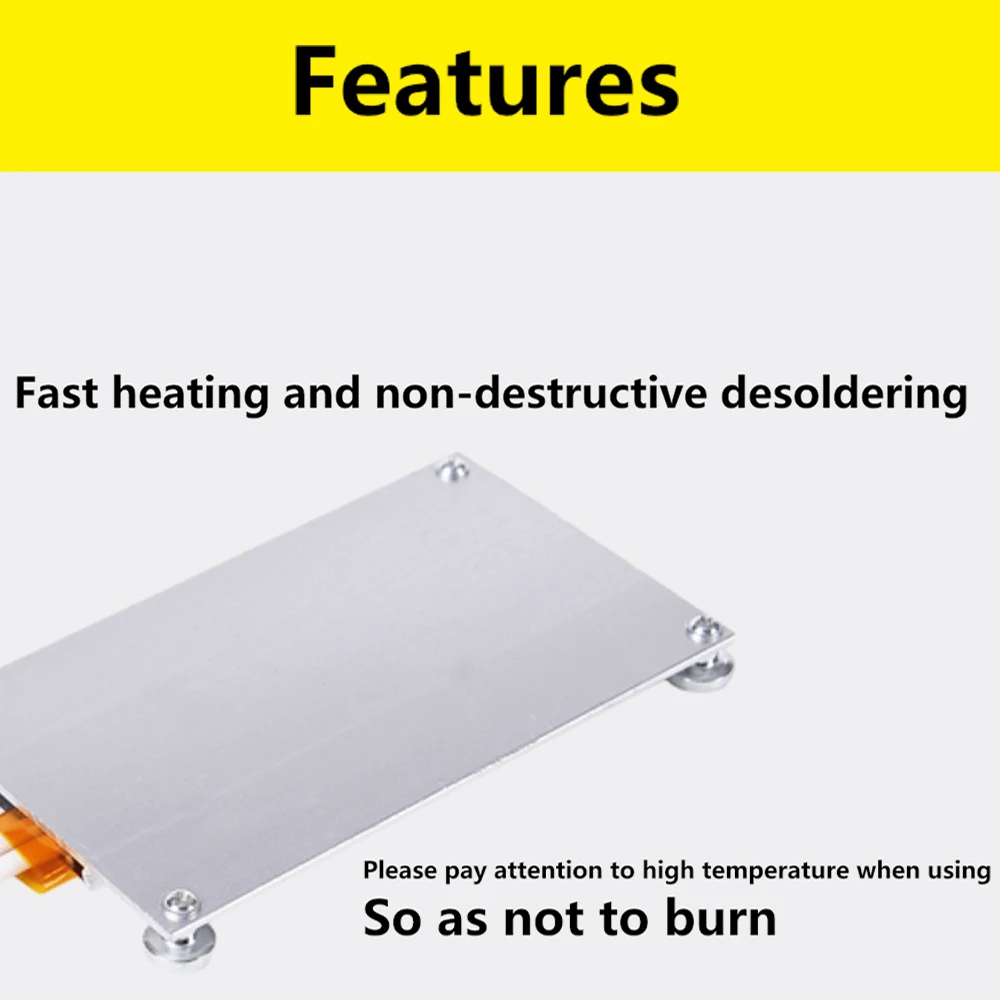 Optimise les espaces de travail avec une exposition contrôlée à la chaleur et un design ergonomique, minimisant les dommages causés par les plinthes lors des restaurations électroniques de haute précision. Station de soudage et dessoudage professionnelle Retirez efficacement la puce LED et les connecteurs FPC avec des plaques en alliage d'aluminium à chaleur rapide (activation de 10 à 30 secondes) pour un reballage précis et une réparation des composants LED Station De Soudage Professionnelle à Air Chaud 2 En 1 + Système T12 Yihua 706 II Station Soudage Ptc Caractéristiques : Retirez efficacement la puce LED et les connecteurs FPC avec des plaques en alliage d'aluminium à chaleur rapide (activation de 10 à 30 secondes) pour un reballage précis et une réparation des composants La construction en alliage d'aluminium garantit une installation stable sans interrupteurs, câbles ou supports à vis, offrant des opérations faciles à utiliser pour simplifier les tâches de soudure. Type optionnel : A 200 W 220 V (écrou de vis et ligne de commutation non inclus), B 300 W 220 V (écrou de vis et ligne de commutation non inclus), C 400 W 220 V (écrou de vis et ligne de commutation non inclus), D 400 W 220 V (écrou de vis et ligne de commutation inclus) Taille A : environ 7 x 7 x 0,6 cm. Elle utilise une technologie de chauffage PTC pour une montée en température stable et une puissante LED (probablement pour éclairer la zone de travail et aider... Idéal pour les techniciens électroniques, les amateurs d'artisanat et les professionnels ayant besoin d'un excellent outil de dessoudage portable pour des réparations complexes de circuits imprimés Remarque : Les mesures étant prises à la main, les tailles indiquées peuvent varier de 1 à 2 cm. Ampoule Led 300w Bga, Puce De Démolition, Soudage, Plaque D'aluminium... Contenu du paquet : 1 plaque chauffante. Taille B : environ 9 x 7 x 0,6 cm. La couleur de l'article peut varier de celle de la photo, en fonction des paramètres d'affichage et de luminosité de votre ordinateur. Plaque chauffante PTC professionnelle à souder pour un reballage efficace et un circuit imprimé. Optimise les espaces de travail avec une exposition contrôlée à la chaleur et un design ergonomique, minimisant les dommages causés par les plinthes lors des restaurations électroniques de haute précision
