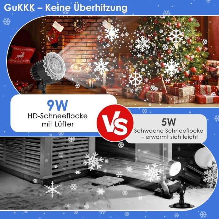 Courant de fonctionnement maximal : 0,64 A. ❆【Cadeau de Noël idéal】 Projecteur de Noël d'extérieur. Projecteur lumineux RGB de Noël, projecteur laser de jardin, éclairage au sol, étanche, avec télécommande, idéal pour les fêtes et les pelouses. Vendu par Home... Nous recommandons une distance de projection de 3 à 10 mètres et une durée d'utilisation continue maximale de douze heures. Matériau du boîtier : Plastique ABS. ❆【Installation facile】 Le projecteur de flocons de neige est facile à installer. Projecteur de Noël LED GuKKK amélioré & Meilleur éclairage de Noël extérieur Caractéristiques du projecteur flocon de neige : Tension de fonctionnement : AC 100 V~240 V / 50~60 Hz. Distance de projection recommandée : 1,5 m à 9 m., Surface couverte : 1 à 15 m². Décoration Fête Lumière Animée Projecteur Noël - Laser Lampe Projecteur LED Étanche - 6 Motifs - Grande Effet Pour Fête Maison Projecteur Laser Extérieur Noël Utilisez-la comme veilleuse pour vos fêtes, célébrations ou événements en intérieur comme en extérieur. PROJECTEUR EXTERIEUR,cold white-20W--Projecteur mural étanche, haute... Le câble d'alimentation extra-long de 5 mètres se branche facilement sur la plupart des prises domestiques, où que vous soyez. Deux options de montage s'offrent à vous : 1., Grâce à sa base ronde, il peut être posé sur une table, au sol ou au mur., 2., Fixez-le aux piquets de sol fournis. Vous verrez ainsi de grands flocons de neige plus lumineux et plus éclatants danser sur vos murs extérieurs, ornant votre maison d'une ambiance féérique. NEUFU LED RGB Laser Projecteur Noël Lumière Décoration Extérieur Paysage Lumineuses EU plug Le cadeau de Noël parfait pour votre famille, vos enfants ou vos amis. Puissance de sortie nominale : 9 W. Résistant à la pluie et à l'humidité, il fonctionnera parfaitement même sous la neige. À vous de choisir, à l'intérieur comme à l'extérieur ! Notre service client se fera un plaisir de vous aider pour un retour ou un remboursement. Convient comme veilleuse au quotidien, à l'intérieur comme à l'extérieur, et idéale pour Halloween, Noël, les mariages, les fêtes, les spectacles, etc. NOUVELLE VERSION DU PROJECTEUR DE NEIGE Crée une ambiance féérique et romantique sous la neige Ce projecteur de flocons de neige projette clairement de grands flocons et de petits amas de neige, créant un effet de tempête de neige. Leur douce danse évoque la magie d'une fée, avec des flocons de formes et de tailles variées. Indice de protection : IP44, IP65 (corps de la lampe). En cas de problème, veuillez nous contacter via Amazon.