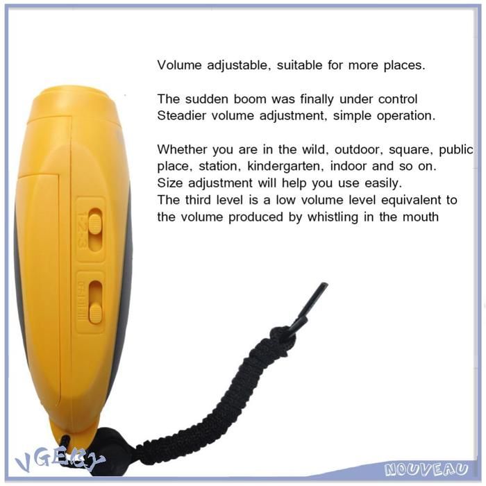 Sifflet Pile CR2032 Portable Sifflet électronique Puissant Rechargeable Par USB Pour Entraîneurs, Noir Sifflet Arbitre Urgence Plein Air Vous pouvez facilement attacher le sifflet à un sac à dos, à un voilier, à un équipement de camping et de randonnée. Vous pouvez également attacher le sifflet à votre ceinture ou à vos bretelles pour une utilisation rapide et facile en cas d'urgence Sifflet électronique Puissant Rechargeable Par USB Pour Entraineurs Noir~p139806533 Sa capacité de réponse rapide en fait un appareil indispensable pour les événements sportifs et les opérations de sauvetage critiques. Sifflet électronique,ABS High Decibel 120DB Sifflet électronique... 【Volume Réglable】 Le volume peut être ajusté de 100 à 125 dB pour être entendu de manière appropriée dans les environnements bruyants ou silencieux et pour envoyer des signaux clairs sur de longues distances. Si vous avez des questions concernant l'emballage, veuillez nous contacter, merci. 【Robustesse & Durabilité】 Le sifflet électronique GOEDCH est fait de plastique robuste de haute qualité qui résiste aux contraintes extrêmes et aux conditions météorologiques défavorables, le rendant idéal comme sifflet pour arbitres ou sifflet de secours fiable. Spécifications: Matériau: Plastique robuste Poids: 60 g Volume: Réglable jusqu'à 125 dB Taille du produit: 15,5 × 3,5 cm Spécifications de la batterie: CR2032 Batterie: Batterie rechargeable intégrée Contenu de l'emballage: 1 x Sifflet Électronique Remarque: Le paquet ne peut pas être contrôlé pendant l'expédition.