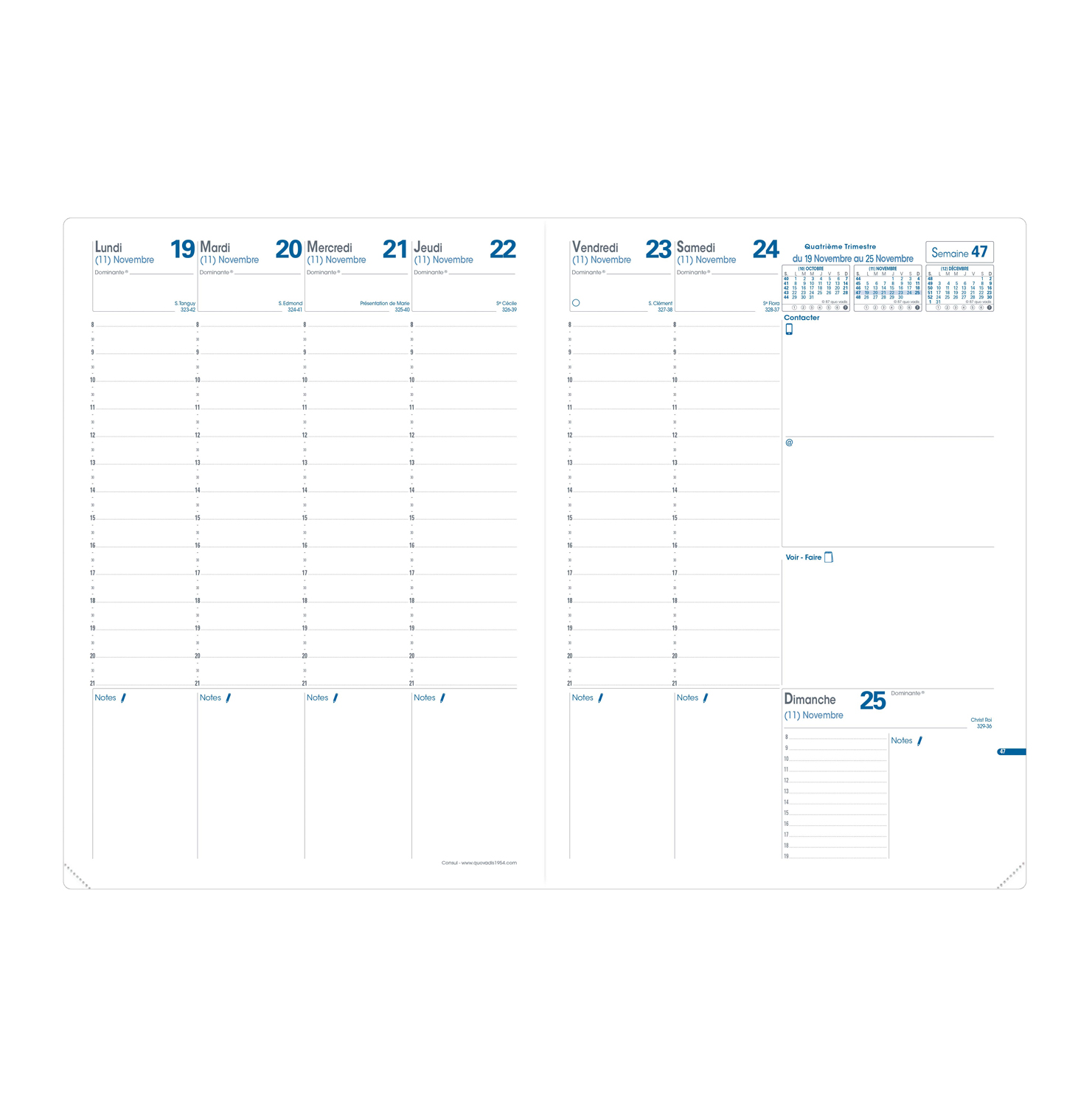 Agenda Semainier Consul Planning Quo Vadis - Organiseur - 2025-2026 - Tier 21 Planing - Seainier Planning - Français - Soho Recharge Agenda Quo Vadis Consul 2026 AGENDA SEMAINIER QUO VADIS MINISTRE 16X24 CM Quo Vadis - Organiseur - 2025-2026 - Tier 21 Planing - Seainier Planning - Français - Soho... Marque française, installée près de Nantes, Quo Vadis s’anime dans plus de 60 pays à travers plus de 10 000 points de vente. Du design des produits, en passant par la couture des couvertures d’agendas, jusqu’à la distribution, les équipes maîtrisent toutes les étapes de fabrication et donnent vie à des produits d’une qualité reconnue. Made in France et engagement environnemental sont des valeurs qu’elle a à cœur de partager avec tous les amoureux du papier. Quo Vadis propose différentes recharges pour vos agendas dans de nombreux formats et modèles vous permettant de conserver votre couverture préférée ! Comprend des cases de notes quotidiennes pour y indiquer ses rappels (personnes à contacter, choses à ) Papier blanc Clairefontaine pour une écriture douce et fluide et coins perforés détachables pour se répérer facilement et rapidement Achetez une recharge Quo Vadis pour utiliser votre couverture amovible plus longtemps Dans la gamme des agendas planning (papier blanc) de Quo Vadis semainier nous allons retrouver les modèles historiques de la marque Ministre, H24/24, Direction, Président, Affaire, Agendascop, Consul, Eurequart, Executif vous trouverez de quoi vous organiser ! Que ce soit dans les gammes les plus simples et élégantes ou les plus originales et tendances, chacun trouvera son bonheur, du...