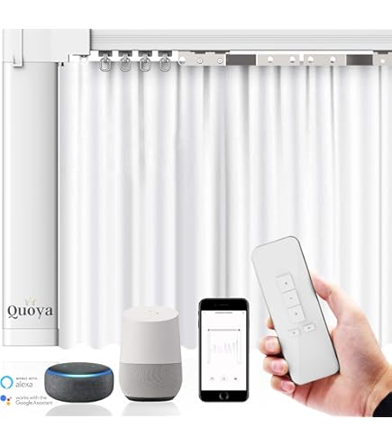Quoya QL500 Smart Curtains System, Electric Curtain Track Remarque : compatible avec les rails de rideaux intelligents Quoya QL500 uniquement Best Motorized Curtain Track Quoya Rail De Rideau Intelligent QL500 - Tous Les Accessoires (Ensemble De Rideaux Ondulés) (pour Le Modèle QL500 Uniquement Kit Ondulation Rideaux Intelligents S'adapte aux fenêtres jusqu'à 3 mètres avec rails réglables et comprend tous les accessoires de montage. Comprend des fonctions intelligentes telles que la commande vocale, l'accès à distance et les paramètres de planification QUOYA QL500 Rail de rideau électrique intelligent, rail otorisé avec...