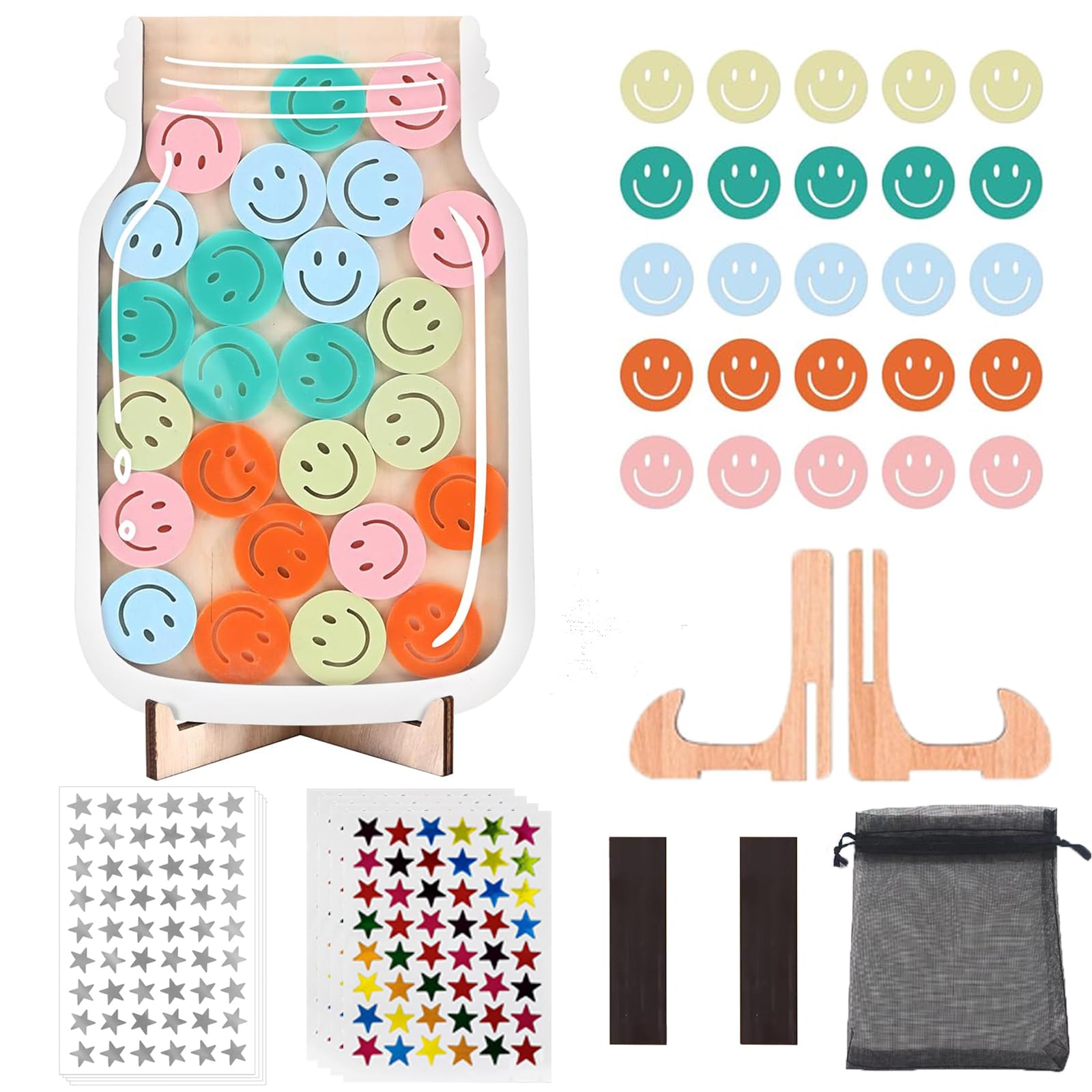 Kit Complet de Bocal de Récompense Magnétique – Comprend 1 bocal de récompense en bois et acrylique transparent, 42 jetons smiley colorés, autocollants lettres DIY, corde en chanvre, support en bois robuste, barres magnétiques puissantes et sac de rangement. Toyvian 100Pcs Jetons Porte-Bonheur Colorés Jetons Au Trésor pour L... Matériaux Durables et Sécurisés – Fabriqué en bois de haute qualité et couches d’acrylique résistantes, ce pot récompense bois est conçu pour durer. Utilisation polyvalente : Magnétique pour frigo/tableau, sur support ou suspendu avec corde. Outil Pédagogique Routine Enfant Bocal De Récompense Magnétique Pour Enfant Avec 42 Jetons Bocal Récompense Enfant Magnétique Parfait pour encourager la persévérance, la coopération et la motivation de l’enfant au quotidien. Produit – Introduction Encouragez la motivation et la bonne conduite avec ce bocal de récompense magnétique en bois et acrylique transparent. Tout le nécessaire pour créer un système de récompense enfant à la maison ou en classe. Les jetons lisses sont sûrs pour les enfants et le support renforcé garantit la stabilité, que ce soit pour un usage à la maison, en crèche ou à l’école. Motivation Ludique et Visuelle – Les couleurs vives et les visages souriants rendent le suivi des comportements amusant et intuitif. Matériaux durables : Bois de qualité et acrylique résistant, jetons lisses et sûrs pour les enfants, support stable inclus. Idéal pour maison, école, enseignants et parents. YouYuer 50PCS Jetons Poker avec Valeur,Jetons Poker Professionnel... Fonctions du Produit Kit complet : 1 bocal de récompense en bois/acrylique, 42 jetons smiley, autocollants lettres DIY, corde, support en bois, barres magnétiques et sac de rangement. Utilisez-le comme tableau de récompense enfant ou bocal de récompense magnétique pour instaurer des routines positives (toilette, lecture, tâches ménagères, coucher à l’heure) et développer la responsabilité et l’estime de soi. Visage De Personnage Smiley De Style Dessin Animé Sur Des Autocollants Colores Carres Differentes Emotions Emoji 502272 2053