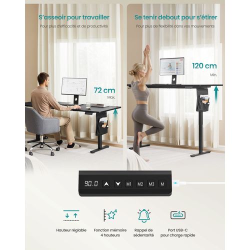 Veillez à ce que tous les accessoires électroniques ne soient pas en contact avec des liquides. La capacité de charge statique maximale du bureau est de 70 kg, veuillez ne pas dépasser cette limite. Ce bureau réglable en hauteur est votre partenaire de travail idéal ! Avec fonction de rappel de sédentarité Remarque : Le plateau est composé de quatre parties distinctes Le fonctionnement silencieux vous permet de rester concentré (< 48 dB) Livraison : 1 x Bureau électrique, 1 x Adaptateur, 1 x Contrôleur Sa hauteur réglable de 72 à 120 cm vous permet d’alterner facilement la position assise et debout selon vos besoins, et de trouver la position de travail optimale. La fonction mémoire avec 4 réglages vous permet d'enregistrer vos hauteurs préférées. Le cadre en acier robuste et le moteur de qualité font monter et descendre le bureau rapidement et en douceur, avec un niveau sonore inférieur à 48 dB, sans vous déconcentrer de votre travail ni vous distraire Le port USB-C permet de recharger facilement votre téléphone ou votre tablette Posture ergonomique : Le réglage en hauteur de 72 à 120 cm favorisant une posture saine. Fonction de recharge rapide Homall Bureau Assis Debout Électrique 180x80 cm Bureau Réglable en 1 x Poche de rangement, 3 x Crochet , 1 x Kit de montage, 1 x Mode d'emploi Il intègre aussi 2 ouvertures pour les câbles, une pochette de rangement et un crochet pour garder tout bien rangé sur votre bureau. Caractéristiques : Couleur : Couleur chêne naturel, blanc mat Stable et silencieux : Le cadre en acier de qualité et le moteur assurent un réglage uniforme même avec une charge de 70 kg. Veuillez utiliser le produit à l'intérieur. Posture ergonomique : Le réglage en hauteur de 72 à 120 cm favorisant une posture saine. Enregistrez jusqu'à 4 hauteurs pour régler rapidement votre siège... Bureau Motorisé Bureau Électrique Réglable - SONGMICS - 180x80 Cm - Mémoire 4 Hauteurs Bureau Assis Debout Electrique Précautions de SONGMICS : Ne placez pas la table directement contre un mur, afin de ne pas rayer le mur pendant le réglage. Tout en ordre : 2 ouvertures passe-câbles, une pochette en tissu pour ranger vos petits objets et un grand crochet pour suspendre un sac ou un casque Le cadre en acier robuste et le moteur de qualité font monter et descendre le bureau rapidement et en douceur, avec un niveau sonore inférieur à 48 dB, sans vous déconcentrer de votre travail ni vous distraire.