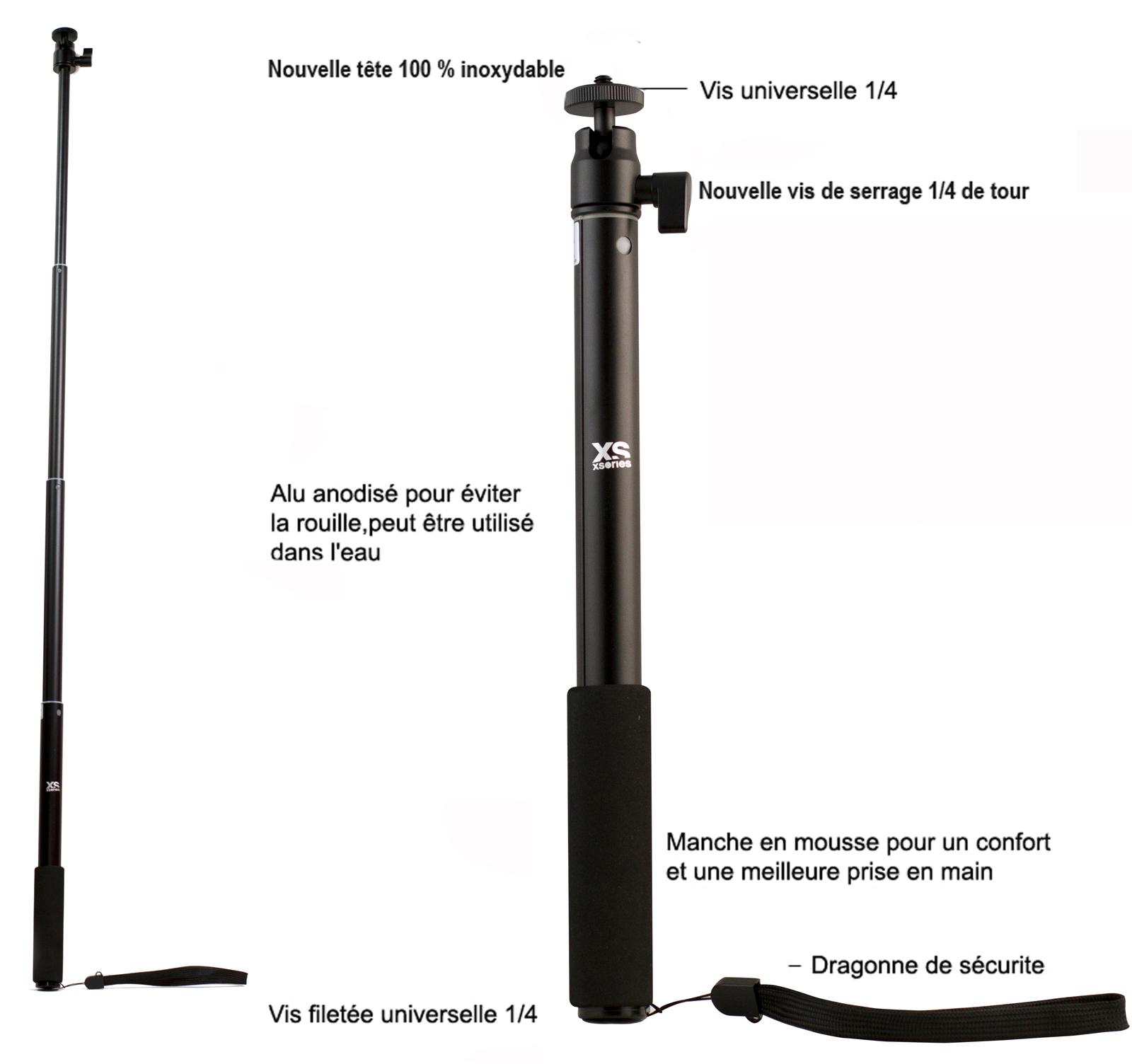 <li>Inclus : un mousqueton et une attache ajustable pour poignet pour plus de sécurité</li> , </ul> Perche Pour Caméra Action Cam WE Bras Perche Selfie Selfie Stick Bâton Réglable Télescopique 1m Avec Support Téléphone Pour Smartphones Contrôle Prise Jack - Bleu - We Perche Telephone XSories U-Shot est une perche télescopique pour capturer des images grâce à la vis standard 6mm, compatible avec toute caméra et action cam. Immortalisez des scènes sous un angle unique avec la perche à selfie XSORIES U-SHOT Bleu. Cette perche télescopique en aluminium et mousse est extensible de 18cm à 49cm et peut supporter un poids maximum de 3kg <li>Perche télescopique pour caméra avec vis standard 6mm</li> <li>Prenez vous en photo, ou prenez des photos depuis un nouvel angle immersif</li> Xsories - Perche Selfie Stick extensible onopod téléscopique BIG U... La série de U-Shot XSories est l'outil parfait pour capturer des photos uniques et créatives: - sports extrêmes- activités loisirs- concerts- voyages- sorties avec des amis- ou simplement en passant du temps avec votre famille. Le U-Shot se bloque dans n’importe quelle position de 18 à 49 cm et pèse seulement 105 g, le rendant très facile à transporter, partout. <li>Extension de la perche : 18 à 49 cm</li> Appareil Photo IPhone 13 Pro Perche Téléscopique Pour GoPro XSories Big U- Shot Silver - Accessoires Perche Camera Sport La poignée entourée de mousse adhérente assure que votre caméra est en sécurité. <li>Tête rotative aluminium ajustable pour sécuriser votre matériel.