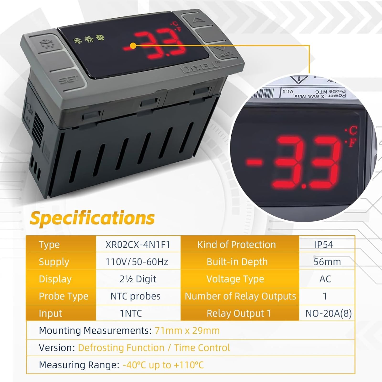 0563 0002 41 | Testo Kit de sonde de réfrigération/climatisation avec Bluetooth, Air / Surface Contenu du paquet : 1 régulateur de température numérique pour réfrigérateur. Thermostat Commercial Réfrigérateur Congélateur Régulateur De Température Numérique STC-8080A + Thermostat De Réfrigérateur Pour Réfrigérateur Dégivrage Automatique Avec Sonde De Capteur NTC 220 V Capteur Double Sonde 120V Caractéristiques : Composant Dimensions : environ 7,9 x 3,7 cm., Quantité : 1 pièce. Achetez des thermostats et régulateurs électroniques pour vos appareils. Pièces détachées de qualité, compatibles, et livraison rapide. Profitez de notre service client réactif et de nos conseils techniques. Commandez facilement en ligne Équipement De Réfrigération Commerciale à Température Contrôlée Pour Entrepôts Frigorifiques... La construction standard OEM garantit une intégration parfaite avec les appareils Norlake et Migali, tandis que les supports de montage inclus simplifient l'installation professionnelle Remarque : Les mesures étant prises à la main, les tailles indiquées peuvent varier de 1 à 2 cm. Remplacement direct pour les contrôleurs de température numériques Dixell XR02CX 4N1F1, avec des opérations précises de 120 V 50 60 Hz et des sondes doubles capteurs pour une régulation précise du climat du réfrigérateur/congélateur Conçu pour les opérateurs de cuisine commerciaux, les techniciens CVC et les spécialistes de la réparation d'appareils nécessitant des remplacements de thermostat de qualité OEM. Le boîtier résiste aux environnements difficiles, avec des capteurs pré-calibrés pour une fonctionnalité de jeu immédiate dans la plupart des systèmes de réfrigération La construction standard OEM garantit une intégration parfaite avec les appareils Norlake et Migali, tandis que les supports de montage inclus simplifient l'installation professionnelle.