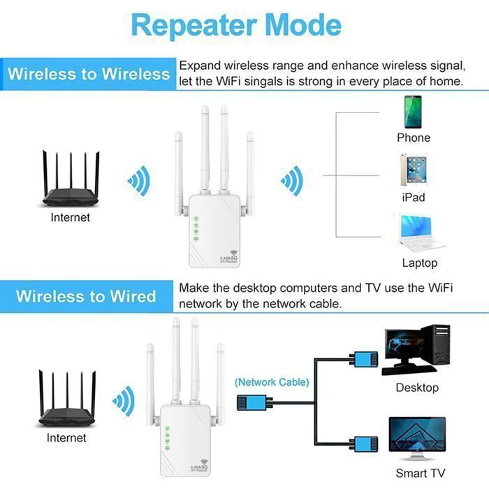 Il augmente la couverture et vous fournit un signal stable. p Un puissant promoteur de wifi domestique étend la couverture de l'internet wi - fi. p le signal du répéteur haute vitesse pénètre dans le mur sans fuite. Avec une portée sans fil élargie à 120 pieds carrés, il ne sera plus affecté par un signal faible. Pages: 1 Point d'accès WiFi et client WIFI avec allocation automatique d'adresses IP (DHCP) p Transmission de protocole basée sur le Protocole IPv4 / address Analysis p le nom de réseau (SSID) du point d'accès WLAN doit être configuré pour être visible p le mot de passe de votre répéteur est le même que celui de votre routeur. 1. Signal haute vitesse et stable, réseau Wi-Fi 1200 Mbps, bande double équence : 5 GHz et 2,4 GHz.5,8 GHz est parfait pour le streaming vidéo HD et les jeux... La couverture Internet Wi - Fi peut être augmentée jusqu'à 2 000 pieds carrés, une plus grande pénétration et aucune perte de signal lors de la traversée des murs, ce qui améliore le réseau wi - fi et vous permet de profiter du Wi - fi dans toute la maison. Minimise la perte de transmission de données, vous permettant de profiter du mode vidéo / jeu HD et de l'Internet haute vitesse. Caractéristiques p Pourquoi avez - vous besoin d'un amplificateur wifi? Pages: 1 - la couverture du routeur est limitée et le prolongateur wifi convient aux grandes pièces, aux bureaux, aux Villas p Il y a des endroits où les réseaux comme multicouches ne peuvent pas être couverts ou ont un mauvais signal. Amplificateur Signal WiFi 2,4G 5G Répéteur Wifi Sans Fil 5Ghz, 1200mbps, 4 Antennes, écran OLED Repeteur Wifi Puissant La vitesse totale de l'amplificateur Wifi est d'environ 1200mps. Minimise la perte de transmission de données, vous permettant de profiter du mode vidéo / jeu... 📶 [Couverture wifi étendue] Quatre antennes externes réglables à gain élevé qui sélectionnent automatiquement la meilleure bande pour vous permettent une excellente couverture. 📶 [Vie intelligente à la maison]L'amplificateur Wi - Fi est conforme à la norme IEEE 802., 11ac / A / B / G / N et prend en charge la connexion simultanée de plus de 30 appareils sans fil, notamment des ipads, des ordinateurs portables, des smartphones, des Webcams, des imprimantes, des appareils Alexa et bien plus encore. Les deux ports Ethernet peuvent être connectés par câble à n'importe quel périphérique Ethernet, tel qu'un téléviseur intelligent, un ordinateur de bureau, etc. 📶 [Universal compatible Security] l'extendeur est compatible avec les principaux périphériques de routeur. amplificateur d'extension fil wifi 6 - 4 antennes double bande 2.4ghz/5ghz, haute vitesse de 1200mbps, port ethernet, mode routeur & wps, pour maison bureau centres commerciaux, extension wifi – maison intelligente Le répéteur Wifi est équipé de radiateurs sur les deux côtés pour éviter les dommages causés par la chaleur. Pages: 1 - Si vous ne voyez pas le réseau sans fil dont vous avez besoin, vous pouvez placer le prolongateur de portée près du routeur et le scanner à nouveau. 📶 [Amplificateur wifi sans fil] l'amplificateur de signal wifi est un signal de fréquence de 2,4 GHz et 5 GHz, le wifi peut atteindre 300 Mbps à 2,4 GHz et 867 Mbps à 5 GHz. Pages: 1 - Connexion la plus fiable recommandée avec plus de 70% des signaux.