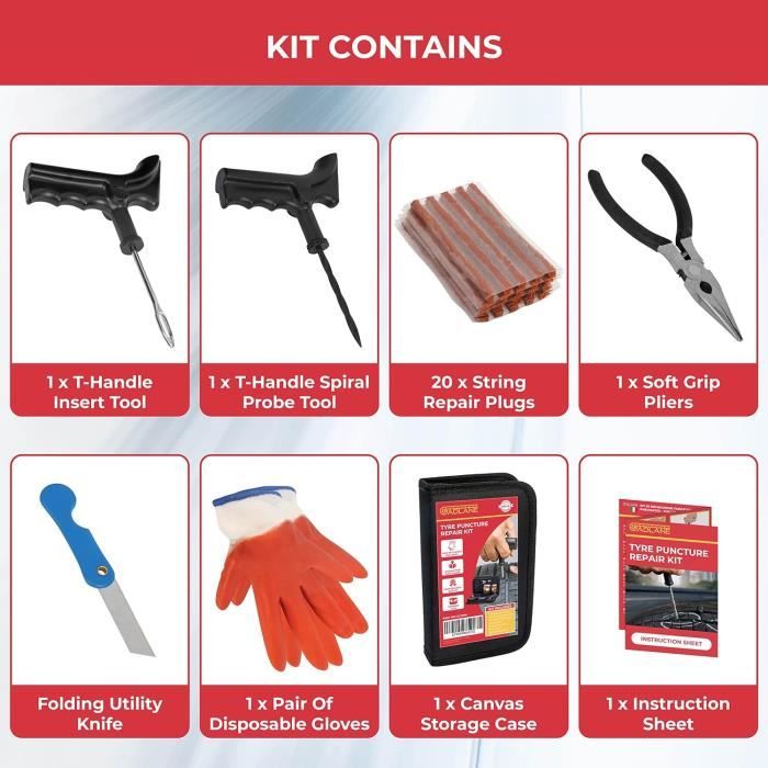 Que ce soit pour les débutants ou les professionnels, ces bandes de réparation sont faciles à utiliser et très efficaces. Contenu du produit : contient 7 sacs de ruban de réparation de crevaison, 5 bandes de réparation par sac (35 bandes au total). Compact et portable : ces bandes de réparation de mèche de pneu sont légères et compactes, se glissent facilement dans un sac ou une voiture et sont parfaites pour les déplacements. Large application : ce kit de réparation de crevaison convient pour réparer les pneus sans chambre à air sur les véhicules tels que les voitures, motos, bus, etc. Kit réparation pneu moto et bombe anti crevaison Facile à utiliser : pas besoin de démonter le pneu de la jante. Kit de réparation indispensable : le kit de réparation idéal pour les véhicules sans chambre à air. Saulee 85 Pièces Kit Reparation Pneu Voiture, Kit Anti... Que vous soyez débutant ou professionnel, ces bandes de réparation sont faciles à utiliser et très efficaces. Chaque bande mesure 100 mm x 6 mm et est idéale pour réparer rapidement les pneus sans chambre à air. Chaque bande mesure 100 mm x 6 mm, idéale pour les réparations rapides des pneus sans chambre à air. Meche Pneu Crevaison 12 Pièces Kit De Réparation De Pneu De Voiture/oto Plug, Répare Les Bandes Autocollantes 100x6 Mm Portable EIF Auto Voiture Moto Pneu Tubeless Pneu Crevaison Aiguille Réparation... Large gamme d'applications : le kit de réparation de pneu de voiture convient à la réparation de pneus sans chambre à air sur les véhicules tels que les voitures, motos, bus, etc.