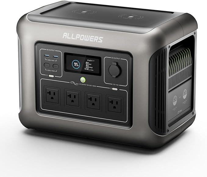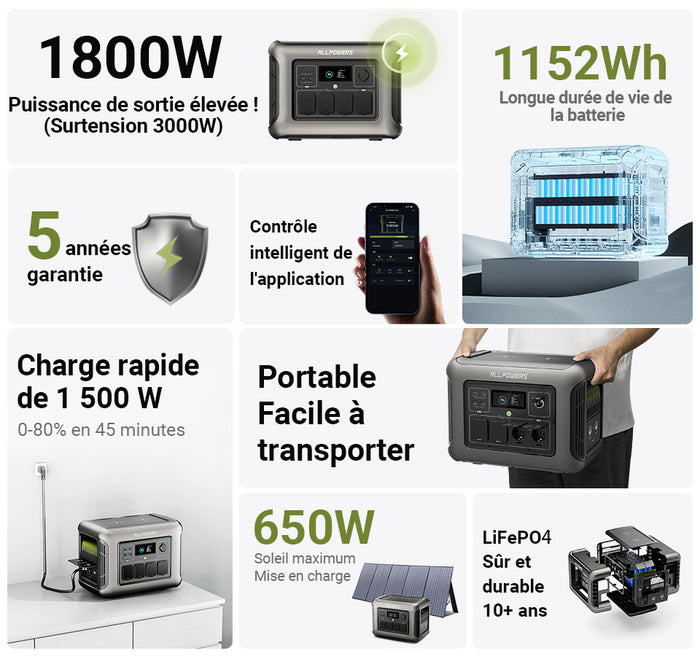Alimentation Camping Secours 1600W ALLPOWERS R1500 LITE Centrale électrique Portable 1600W Allpowers R1500 Lite Prix ALLPOWERS 1800W Générateur Solaire R1500 avec PV100W - ALLPOWERS FR Le ALLPOWERS R1500 est une centrale électrique portable qui offre une capacité impressionnante de 1152 Wh et permet de charger jusqu'à 11 appareils... Alimentez jusqu'à 9 appareils simultanément : R1500 LITE Centrale électrique portable avec une capacité de 1 056 Wh, la station d'alimentation portable ALLPOWERS R1500 LITE offre une puissance de sortie CA de 1 600 W (3 200 W en cas de surtension) et 9 ports (4 x 1 600 W en sortie CA, 2 x 100 W USB-C, 2 x 100 W USB-A et 1 x 1 allume-cigare), idéale pour le camping, les voyages en camping-car, les pannes de courant et les travaux en zones reculées. Le mode silencieux, très pratique, est idéal pour dormir ou lire. Alimentation de secours fiable : Grâce à son alimentation sans interruption, l'ALLPOWERS R1500 LITE bascule en 15 ms en cas de panne de courant, protégeant ainsi votre serveur NAS, votre routeur Wi-Fi et votre PC. Contenu de la boîte : station d'alimentation ALLPOWERS R1500 LITE, câble de charge secteur, manuel d'utilisation et garantie exclusive de 6 ans. Son niveau sonore de 35 dB est équivalent à celui d'une bibliothèque. Plus léger et plus intelligent : ALLPOWERS R1500 LITE ne pèse que 14 kg. Tenez-le d'une seule main grâce à sa poignée dissimulée et transportez-le facilement, de votre bureau à votre camping ou votre chalet isolé. Recharge rapide solaire 650 W] : La R1500 LITE d'ALLPOWERS est dotée d'un contrôleur de charge MPPT intégré avec 650 W une entrée solaire USB. De plus, aucun adaptateur encombrant n'est requis, un seul câble peut être utilisé pour recharger de 0 à 80 % en 40 minutes avec 1200 W une entrée USB Max, qui est plus élevée que celle d...