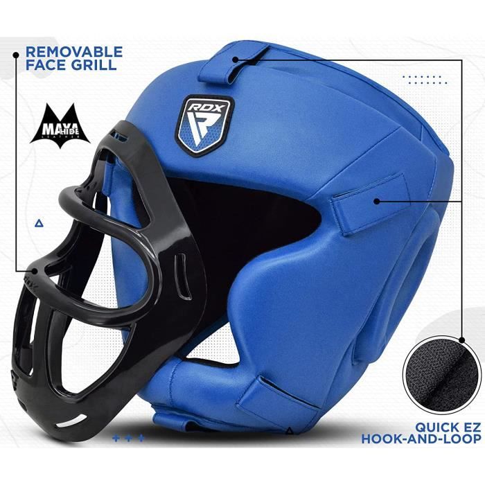 Casque Grille Faciale Amovible RDX Casque De Boxe MMA Entraînement Maya Hide Cuir Head Guard Twins Boxe Buy RDX Groin Protector for Boxing, uay Thai, Kickboxing and A... RDX Casque de Boxe MMA Entraînement, Maya Hide Cuir Head La partie supérieure ouverte et les oreillettes ouvertes du casque de boxe permettent la circulation de l'air pour la ventilation et réduisent au minimum l'accumulation de sueur à travers la doublure intérieure à séchage rapide. RDX Casque de Boxe MMA Entraînement Maya Hide Cuir Head... Rembourrage de mousse Tri-Max losa-shock basé shell-shock de haute intensité d'absorption de chocs Conçu avec plusieurs couches de rembourrage pour une absorption maximale des chocs et une grille en PVC amovible pour protéger le visage, le nez et les yeux des chocs puissants, c'est le casque le plus avancé du ring. Ce casque de boxe pour homme est livré avec un système de fermeture à crochet et boucle pour le maintenir en place pendant les combats, tandis que la mentonnière réglable du casque d'entraînement offre un ajustement personnalisé afin que vous puissiez rester concentré pendant vos séances d'entraînement. Le casque de boxe RDX est fabriqué en cuir Maya Hide pour une durabilité et une résistance accrues.