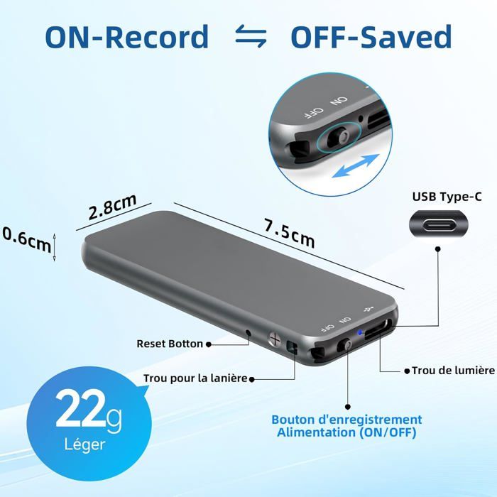 ⏺【Qualité Sonore Exceptionnelle à 1536 Kbps】Nouvelle puce d'enregistrement intelligente 2159 récemment mise à niveau, équipée de la technologie de réduction intelligente du bruit DSP, qui filtre davantage de bruits de fond que les autres puces pendant l'enregistrement. Description Le dictaphone Howabo 64Go est votre allié pour capturer chaque moment important ! Avec 60h d'autonomie (batterie 1050mAh) et 64Go de mémoire, il enregistre jusqu'à 750h de audio. Fonctions avancées : activation vocale, sauvegarde automatique, minuterie, répétition A-B, protection par motde passe. Boîtier métallique léger (40g), écran rétroéclairage, connexion USB-C... Idéal pour enregistrer de longues réunions, des interviews, des cours, des créations musicales, etc L'ordinateur manque de pilotes et ne peut reconnaître aucun périphérique. Enregistreur USB-C Métallique Compact Dictaphone GENERIQUE Réduction Du Bruit Hd Dictaphone Mini Enregistreur Dictaphone Activation Vocale Automatique Un magnétophone est aussi une œuvre d'art S'il n'y a pas de connexion à ce stade, veuillez attendre 10 secondes +. De plus, la coque métallique grise dure est confortable au toucher et présente un léger éclat, vous offrant un plaisir visuel concis, haut de gamme et élégant. 🔊【Utilisation Simple : Enregistrement en un Clic】Faites glisser le bouton d'enregistrement vers le haut pour démarrer l'enregistrement, vers le bas pour enregistrer, et les fichiers sont nommés avec la date et l'heure. 🔊【Activation Vocale Intelligente : Réduction des Silences】Lors de l'enregistrement en mode d'activation vocale : démarrage automatique de l'enregistrement lorsqu'un son est détecté, pause lorsque le son est faible/silencieux, réduction des segments silencieux et des chuchotements inutiles, et économie efficace de mémoire et d'énergie. Utilisateurs MAC: veuillez passer à un adaptateur de type C. J'apprécie vraiment votre soutien! Howabo Enregistreur vocal 60 heures, 64 Go, boîtier métallique Changez le port et l'ordinateur. (L'activation vocale est désactivée par défaut. Si vous rencontrez des problèmes, veuillez nous en informer et l'équipe d'assistance après-vente Howabo vous répondra et les résoudra rapidement dans les 24 heures les jours ouvrables