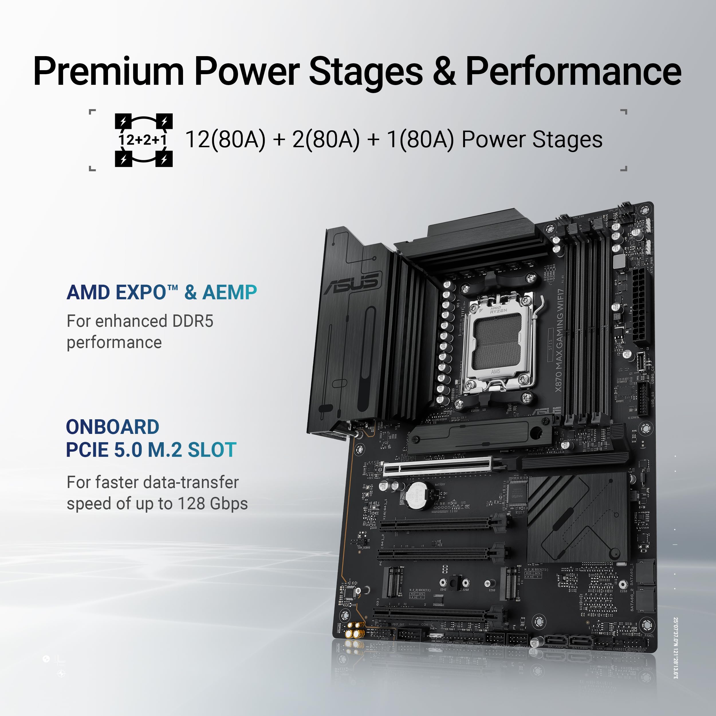 Carte Mere Am5 ASUS X870 MAX GAMING WIFI7 W (RTL) AM5 X870 4xPCI-E HDMI 2.5GbLAN+WiFi+BT SATA A Carte Mere Ddr5 Dotée d'une conception robuste, de solutions de refroidissement complètes et d'options de réglage intelligentes, la carte mère X870 MAX GAMING WIFI7 W offre aux utilisateurs et aux bricoleurs une gamme d'optimisations des performances via des fonctions logicielles et micrologicielles intuitives Carte mère ASUS X870 MAX GAMING WIFI7 ATX Socket AM5 Chipset AMD X870 2, Ethernet 2,5 Go, ports USB 4 (40 Gbps) Type-C, port USB 20 Gbps Type-C à l'avant Carte mère ASUS X870 MAX GAMING WIFI7 W ATX Socket AM5 Chipset AMD X870... 2 et PCH, tête de ventilateur hybride et Fan Xpert 4 avec AI Cooling II Prêt pour les PC IA avancés : conçu pour l'avenir de l'informatique IA, avec les performances et la connectivité nécessaires pour les applications d'IA exigeantes Connectivité ultra-rapide: Wi-Fi 7, slot PCIe 5., 0 x16, PCIe 5., 0 M. Les cartes mères ASUS de la série X870 sont conçues de manière experte pour libérer tout le potentiel des processeurs AMD Ryzen™ de la série 9000., Dotée d'une conception robuste, de solutions de refroidissement complètes et d'options de réglage intelligentes, la carte mère X870 MAX GAMING WIFI7 W offre aux utilisateurs et aux bricoleurs une gamme d'optimisations des performances via des fonctions logicielles et micrologicielles intuitives.