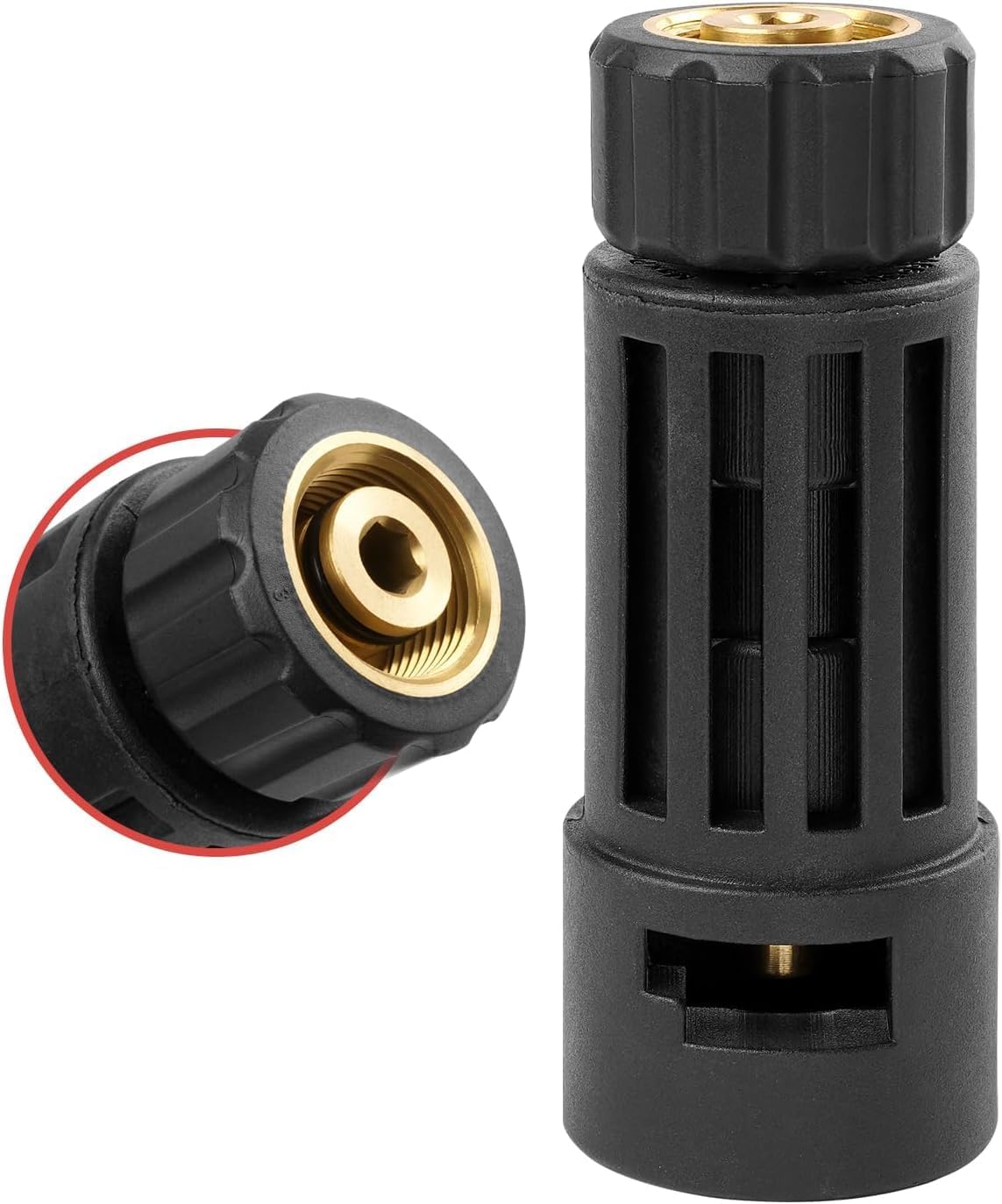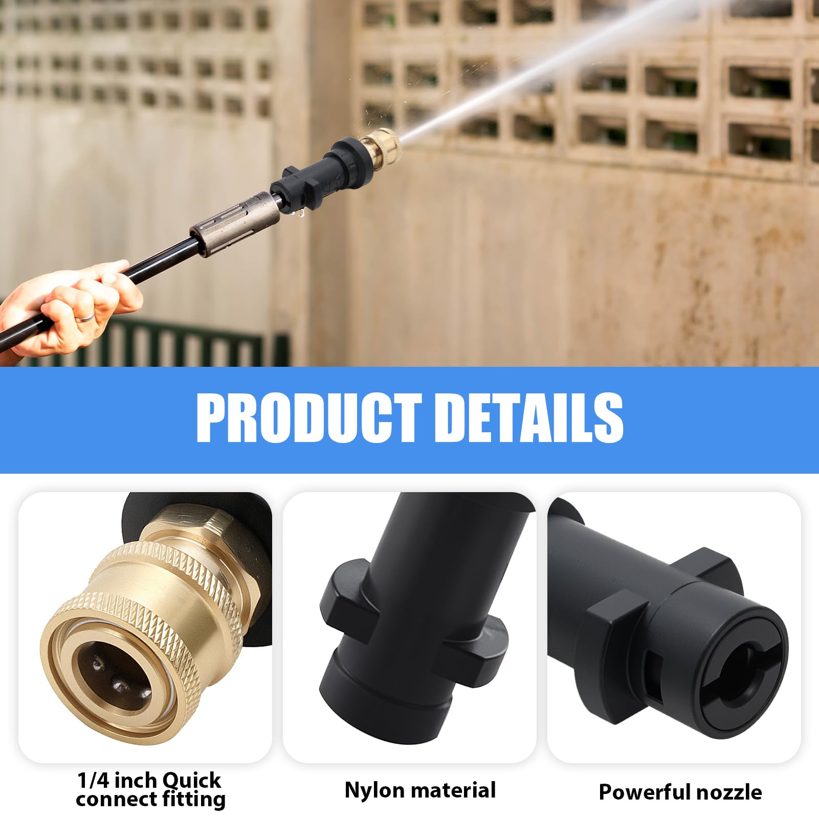 Kit de nettoyage haute pression : comprend 1 adaptateur (environ 9,1 × 3,1 cm) et 5 têtes de buse multifonctions (0° rouge/15° jaune/25° vert/40° blanc/65° noir) pour répondre aux différents besoins de nettoyage. Alignez le connecteur de la buse avec le port avant de l'adaptateur et insérez-le directement dans le bas. Buse Karcher K2 Raccord Femelle à Connexion Rapide De 6,35 Mm Avec Buse De Accessoire Lavage Voiture Sol FGDCHNJ Pistolet de nettoyage haute pression de rechange pour voiture... Après l'insertion, appuyez sur la tête de la buse (ou tirez doucement vers l'extérieur) jusqu'à ce que vous entendiez un « clic », indiquant que le loquet interne est sécurisé. Matériaux : laiton/acier inoxydable, caoutchouc., Dimensions : 91 x 31 mm. Dimensions de l'emballage : 135 x 84 x 48 mm. Large gamme d'applications : l'adaptateur de nettoyeur haute pression est compatible avec plusieurs modèles (K2 à K7) et peut être connecté à tous les accessoires de 6,35 mm. À l'autre extrémité, insérez la partie en caoutchouc dans le pistolet pulvérisateur et tournez-la dans le sens des aiguilles d'une montre pour la verrouiller en place. Poids : adaptateur : 98 g, tête de buse : 84 g., Pression maximale : 2000 psi. Sortie haute pression de 2000 psi, facile à utiliser et nettoyage très efficace Compatibilité : compatible uniquement avec les nettoyeurs haute pression Karcher K2, K3, K4, K5, K6 et K7., Compatible avec les connecteurs standard 1/4. Raccord femelle à connexion rapide de 6,35 mm, conçu pour s'adapter à de nombreux types de canons de pistolet. Ce produit comprend 5 embouts de buse de différentes couleurs et angles pour une polyvalence accrue dans vos tâches de nettoyage Design : la conception de la douille à verrouillage automatique assure une stabilité durable et une durabilité lors des tâches de nettoyage. Vous êtes maintenant prêt à nettoyer une variété d'articles Température de fonctionnement : jusqu'à 60 °C. Hicello Raccord femelle à connexion rapide de 6,35 mm avec buse de pulvérisation pour nettoyeur haute pression, adaptateur à connexion rapide avec 5 buses de nettoyeur haute pression multi-degrés pour