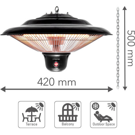 La combinaison astucieuse d’un chauffage radiant et d’une lampe de plafond fait du chauffage radiant de plafond IR 2010 SC une solution aussi attrayante qu’économique pour la restauration d’extérieur. Chauffage | Chauffage d'appoint | TROTEC Une chaleur efficace, immédiatement perceptible sur la peau. Chauffage Salle De Bain Chauffage Extérieur Couvert Radiant Infrarouge TROTEC IR 2010 S - Chauffage Terrasse 2000W 3 Niveaux Trotec Ir 2010s Chauffage Restaurant Extérieur Le chauffage radiant de plafond design IR 2010 SC dispense une chaleur de bien-être ciblée sans pré-chauffage, pour un chauffage sans complication des tables dans la restauration d’extérieur ou pour les moments douillets sur le balcon ou la terrasse. Très pratique, la télécommande IR permet de commander le chauffage radiant infrarouge halogène IR 2010 SC à distance en tout confort. Radiant suspendu design Trotec IR 1500 SC - chauffage pour 10m2, 1500W... Le chauffage radiant de plafond design IR 2010 SC attire tous les regards avec son boîtier design très réussi. Et pendant les chaudes nuits d’été, la lumière blanche et agréable de l’éclairage de table à LED est là pour assurer une ambiance toute conviviale. Avec trois niveaux de chauffage (650 W / 1 350 W / 2 000 W), les tubes chauffants halogène de l'IR 2000 SC, moins éblouissants que d'autres produits, délivrent... Comble du confort : même l’éclairage de table à LED peut être allumé ou éteint avec la télécommande. Il suffit d’une pression sur une touche pour inonder la zone visée d’une chaleur agréable et douillette. Le rayonnement sur 360° vers le bas de l’IR 2010 SC réchauffe de manière ciblée les espaces allant jusqu’à 15 m², sans attente désagréable et sans odeur ni bruit gênant. Trotec IR 2010 SC Un bienfait pour les yeux, sous tous les angles.