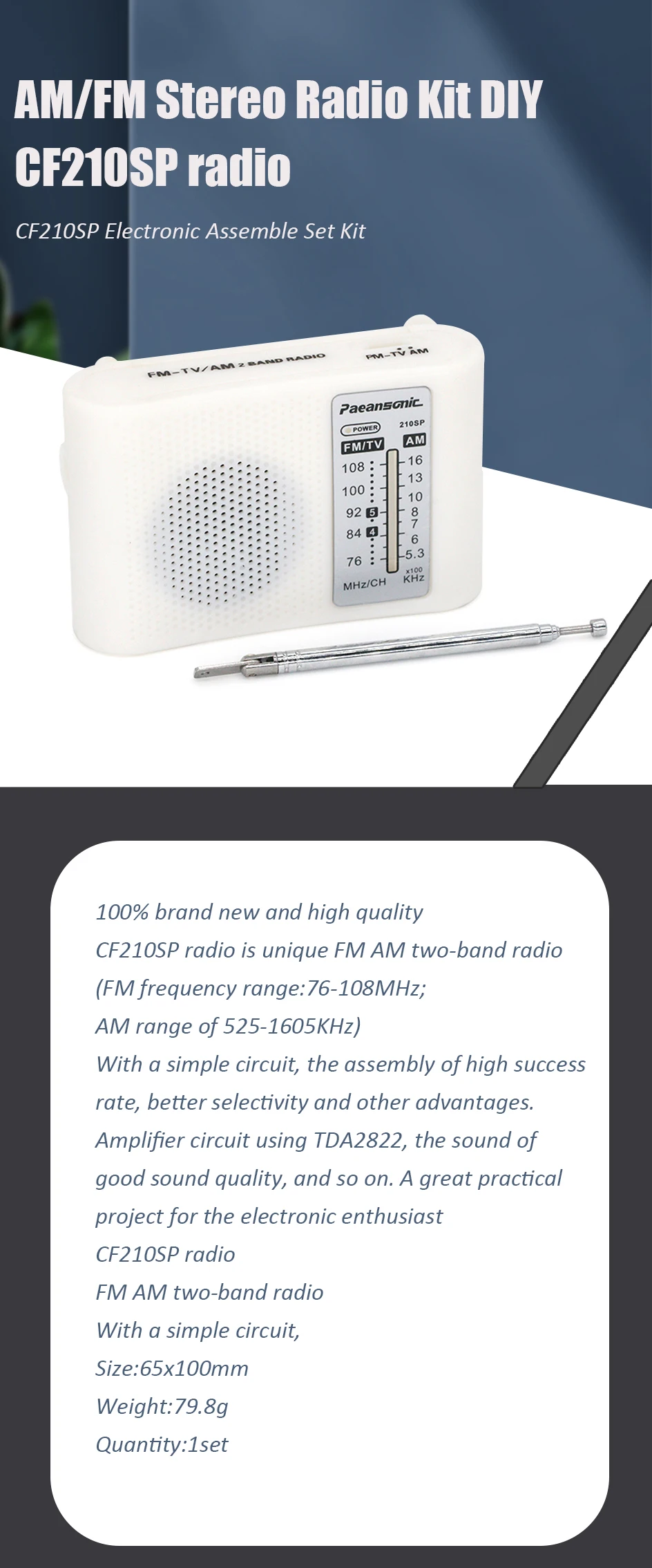 KIT RADIO AM/FM ESTÉREO CF210SP Kit Radio DIY FM AM Kit électronique Alanmoship CF210SP Kit De Radio Stéréo AM FM Kit D'assemblage Radio Fm Projet Bricolage électronique Ce kit de radio stéréo AM/FM CF210SP est conçu pour les produits de bricolage que vous devez souder vous-même. La technologie radio FM AM double bande de fréquence unique est stable et Facile à souder et à utiliser, le circuit est simple, bonne sélectivité, taux de réussite élevé de l'assemblage Frefgikty Dimensions : 10 x 5 x 3 cm. CF210SP-Kit de radio stéréo AM/FM, kit d'assemblage électronique portable, pièces de bricolage pour apprenants ... Service de livraison : Colissimo Colis Privé... Remarque : la couleur réelle de l'article peut être légèrement différente de celle de la photo. Contenu de l'emballage : 1 kit de radio.
