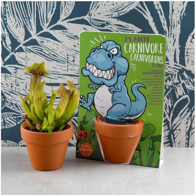 La croissance est lente et peut prendre plusieurs mois à plus d'un an pour devenir adulte. Idéal pour un rebord de fenêtre ensoleillé, ce kit offre une activité amusante et éducative pour toute la famille. Avec notre kit T-Rex Dinosaure et Plantes Carnivores à Semer - Carte avec Pot, faites découvrir aux plus jeunes les fascinantes plantes carnivores qui existaient déjà à l'époque des dinosaures. Il contient tout ce qu'il faut pour réussir la culture de plantes carnivores. Sarracénie T-Rex Cadeau Radis Et Capucine - T-rex Dinosaure Et Plantes Carnivores à Semer - Carte Avec Pot - Plantes Idée Cadeau Original Enfant Avec des instructions simples, les enfants pourront facilement semer et voir pousser ces plantes incroyables. Ne laissez pas la terre de coco sécher. Maintenez une bonne hygrométrie jusqu'à 70 %. La Sarracenia purpurea transforme ses feuilles en urnes ouvertes contenant du nectar. Plante éternelle avec coupelle en terre cuite - Rose de Jéricho Utilisez une cuillère pour remplir le pot avec cette terre, en gardant une petite partie pour recouvrir les graines après le semis. Placez à température ambiante et utilisez une bouteille coupée en deux pour servir de mini serre, concentrant chaleur et humidité. Les insectes attirés par l'odeur y pénètrent et ne peuvent plus remonter les parois lisses, fournissant ainsi un complément nutritionnel à la plante. Aérez si le semis est trop dense. Grâce à ces petites graines à semer, ils apprennent la patience tout en découvrant le processus de germination. Chaque semis s’accompagne d’un petit personnage rigolo illustré sur la carte Ce kit éducatif et ludique inclut tout le nécessaire pour semer des graines de sarracénie en pot et observer ces plantes capturer des mouches. C'est une idée... Semis des graines : Semez les graines à 0,5 cm de profondeur dans le terreau très humide. Gardez les plantules sous la bouteille plastique pour conserver chaleur et humidité. Utilisez une bouteille plastique découpée comme serre. Repiquage et croissance : Pas besoin de repiquer, la culture se fait en semis direct. Floraison : Placez la plante en plein soleil, à l'extérieur entre 15 et 30 °C en été, et hivernez à moins de 15 °C. Exposez à la lumière du soleil derrière une vitre, sans placer au-dessus d'un chauffage.