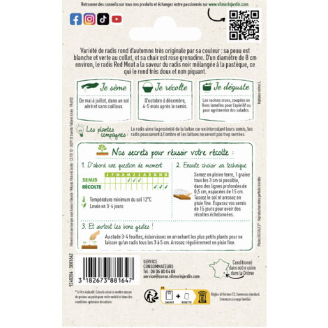 GRAINES RADIS DE 18 JOURS VILMORIN® | boutique-EVL Assortiment de graines - VILMORIN - Radis Saxa 2 - Chair ferme et... Diamètre 8cm Variété Japonaise Radis Pernot Clair Série 0 Sachet Graines 8 G - Vilmorin Radis Chair Rose Doux Radis : choisir les meilleures variétés pour les récoltes d'automne et... Variété de radis rond très originale par sa couleur : sa peau est blanche et verte au collet, et sa chair est rose grenadine. Le radis Red Meat est une variété de radis rond très originale par sa couleur : sa peau est blanche et verte au collet, et sa chair est rose grenadine.