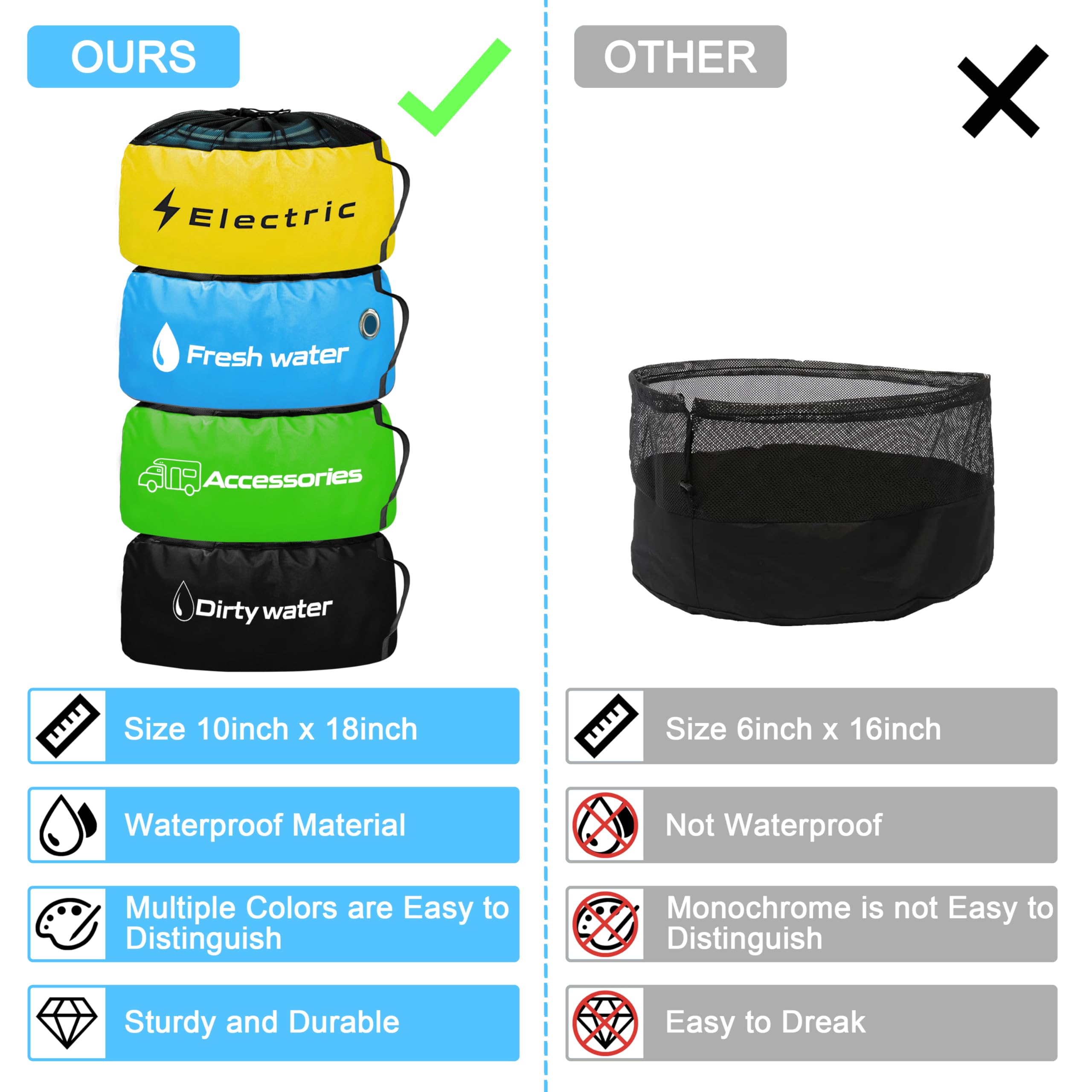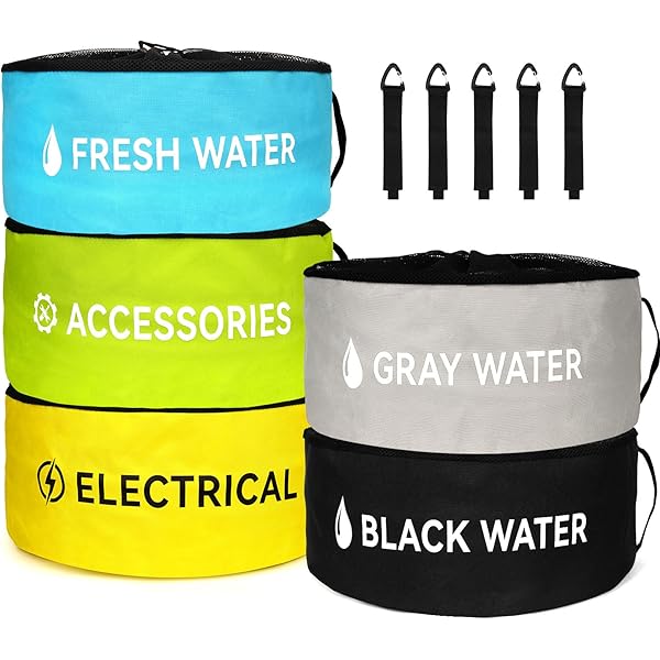 Lot de 4 sacs de rangement pliables à fermeture éclair avec poignée et fenêtre transparente pour Idéal pour vivre en camping-car et organiser des garages, entrepôts, sous-sols, hangars, ateliers, etc. Ensemble 4 Sacs Tuyau Eau égout Câble MSA Sac De Rangement Pour Tuyau D'Arrosage En Nylon Durable Pour Camping-Car Accessoires De Rangement Pour Camping Car [Conception spacieuse] Avec une taille de 18 x 20 pouces, ces sacs offrent suffisamment d'espace pour stocker jusqu'à 100 pieds de tuyau d'eau, de tuyau d'égout et les cordons électriques. Mon test et avis du meilleur tuyau camping car en 2025 Jeffergarden Sacs de rangement pour tuyaux de camping-car, sac d... Spécification Type d'article : sac de rangement pour tuyau de camping-car Matériau : tissu Oxford 600D., Taille étendue : env. [Solution de rangement pratique pour camping-car] Nos sacs de rangement vous aident à organiser rapidement les cordons et tuyaux électriques, rendant vos voyages en camping-car plus agréables sans avoir à chercher des accessoires dans un compartiment de rangement encombré pour camping-car. [Ensemble de 4] Cet ensemble comprend 4 sacs de rangement de différentes couleurs, bleu pour le tuyau d'eau, noir pour le tuyau d'égout, jaune pour le cordon électrique et vert pour les accessoires de camping-car. Les étiquettes en caoutchouc facilitent l’identification. Récupérez facilement ce dont vous avez besoin et ce que vous voulez. Caractéristiques [Ensemble de 4] Cet ensemble comprend 4 sacs de rangement de différentes couleurs, bleu pour le tuyau d'eau, noir pour le tuyau d'égout, jaune pour le cordon électrique et vert pour les accessoires de camping-car.