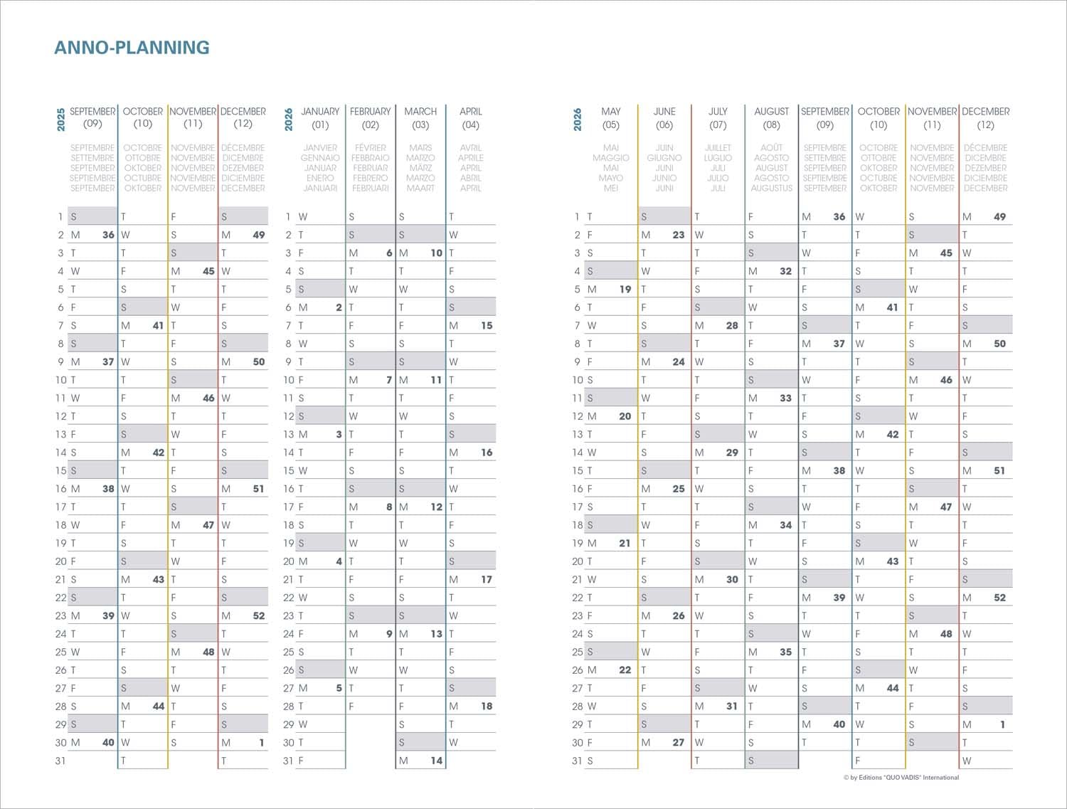 Agenda semainier Meline - 18,5 x 22,5 cm - Bleu foncé - Septembre Nos agendas 16 mois Andrea sauront vous séduire grâce à leurs couvertures amovibles au toucher velouté et aux couleurs intemporelles et tendances Papier Blanc Clairefontaine Onglets Mensuels Quo Vadis - Recharge Agenda 16 Mois - 2025-2026 - Planning SD Planificateur Semaine Notes Créatrice de moments uniques et de souvenirs depuis plus de 60 ans, Quo Vadis s’adresse à tous ceux qui ont soif d’émotions, d’authenticité, de déconnexion, tout en se montrant respectueux de notre planète. Made in France et engagement environnemental sont des valeurs qu’elle a à cœur de partager avec tous les amoureux du papier. Tirvit | CALENDRIER QUO VADIS 16 MOIS 1 SEMAINE/2 PAGES 21X15CM TIMER... Du design des produits, en passant par la couture des couvertures d’agendas, jusqu’à la distribution, les équipes maîtrisent toutes les étapes de fabrication et donnent vie à des produits d’une qualité reconnue. Agenda hebdomadaire avec une présentation de la semaine sur la page de gauche et une page de notes sur la droite pour un usage 2-en-1 agenda-carnet Couverture amovible et rechargeable pour une utilisation longue durée Papier blanc Clairefontaine pour une écriture douce et fluide