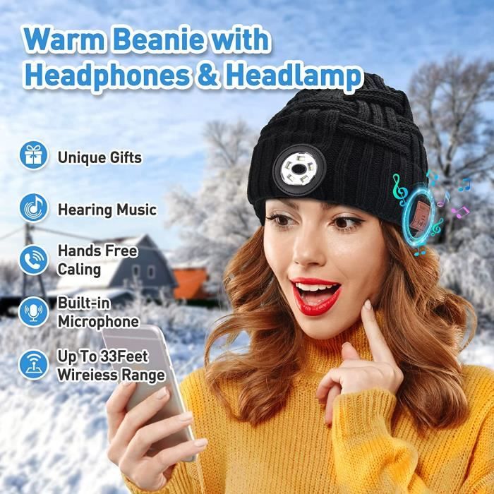 Le style simple complète n'importe quelle tenue, que ce soit avec un sweat-shirt ou une veste pour un look élégant, vous gardant au chaud et stylé. Bonnet Connecté Bluetooth ATNKE Unisexe LED Bluetooth Bonnet Lampe Frontale,USB Rechargeable 4 LED Musique Parleur Chapeau De Course Lumière Chaud Polaire Doublée Tricot Bonnet Lampe Frontale Running 【Chapeau Technologique à LED Bluetooth à la Mode】: Dernier bonnet musical sans fil, conçu avec une bande LED colorée clignotante, original et à la mode, plein de technologie et étonnant. DÉTACHABLE ET LAVABLE]Il suffit de tirer le bord du bonnet tricoté et de pousser la lumière vers l'intérieur pour séparer la lumière et laver le capuchon ou charger la lumière, sans fils supplémentaires Un microphone haute sensibilité et une technologie d'annulation d'écho garantissent que vos appels sont clairement entendus, même dans les rues bruyantes ou sur les terrains de sport. Chargez avec un ordinateur ou une batterie externe. TOOAD Bonnet Bluetooth avec lumière noire, capuchon de lampe frontale... Profitez de la liberté de la musique sans fil et des appels, vous permettant de vous concentrer sur vos tâches sans sacrifier le confort. Parfait aussi comme cadeau de Noël, d'anniversaire ou du Nouvel An pour votre père, mari, petit ami et tous ceux que vous aimez. 7 modes de lumière LED ajustables, passez entre différentes couleurs. Bonnet tricoté Bluetooth KINGTRONG - Bonnet lumineux LED pour course et Connectez-vous facilement à votre smartphone ou à d'autres appareils Bluetooth. 【Chaleur Hivernale et Praticité】: Tissu tricoté à haute élasticité, doux et respectueux de la peau.