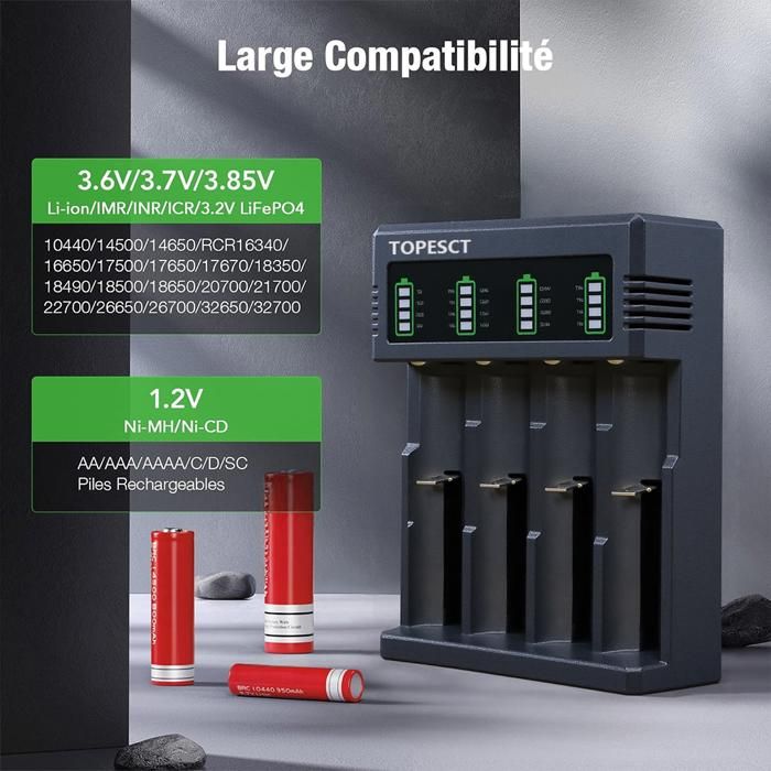 Chargeur de batterie 18650 4 baies avec écran LCD pour batterie rechargeable 3,7 V/1,2 V pour batteries Li-ion 18650 14500, piles Ni-MH/Ni-Cd A AA AAA (non... Recharge Intelligente à Double Canal: Chaque slot fonctionne indépendamment pour une charge simultanée optimisée; le courant est ajusté automatiquement selon le type de pile détecté Affichage LED Clair pour Chaque Slot: Voyant lumineux vert pour suivre l’avancement de la charge; clignote à 25 % 50 % 75 % puis reste fixe à 100 %; permet de vérifier l’état des piles en un coup d’œil sans manipulation superflue Chargeur Piles Rechargeables Aa Et Aaa Lc4000d 18650 Chargeur De Piles Rechargeable Batterie Avec 4 Fentes Et Chargeur 18650 21700 Compatibilité Etendue avec de Nombreux Formats de Piles: Chargeurs de piles prise en charge des batteries Li-ion 3,7V et NiMH/NiCd; chargeur piles rechargeable compatible avec 26650 21700 20700 18650 14500 10440 16340 AA AAA; idéal pour lampes télécommandes jouets et autres Chargeurs Des Piles Usb(. 709 résultats. ) ; Chargeur de piles · 9,99 € ; Clip Sonic / Chargeur de piles · 6,99 € ; Générique · 13,93 € ; Générique / Chargeur de piles Nom du produit: Chargeur accu 18650Compatible: Chargeur Universel Intelligent Double Slot pour 26650 21700 20700 18650 14500 10440 16340 AA AAA; batteries Li-ion 3,7V et NiMH/NiCdQuantité : Chargeur accu cigarette electroniqueEnsemble ou combinaison : Produit individuel avec double emplacement de charge indépendantMatériau : Plastique ABS ignifugé de haute qualité avec rails métalliques en acier inoxydableFonction: Recharge intelligente pour piles rechargeables Li-ion 3,6V/3,7V et NiMH/NiCd 1,2V; détection automatique du type de batterie; mode de charge rapide ou lente; indicateurs LED pour chaque slot; protections contre surcharge, surchauffe, court-circuitUtilisation Prévue: Chargeur piles rechargeable destiné à recharger une large gamme de piles cylindriques utilisées dans les lampes torches, jouets, télécommandes, appareils photo, outils électroniques, etc; convient pour une utilisation domestique, en déplacement ou en atelier 18 Solts Chargeurs de Piles Rechargeable LCD Intelligent Piles Chargeur