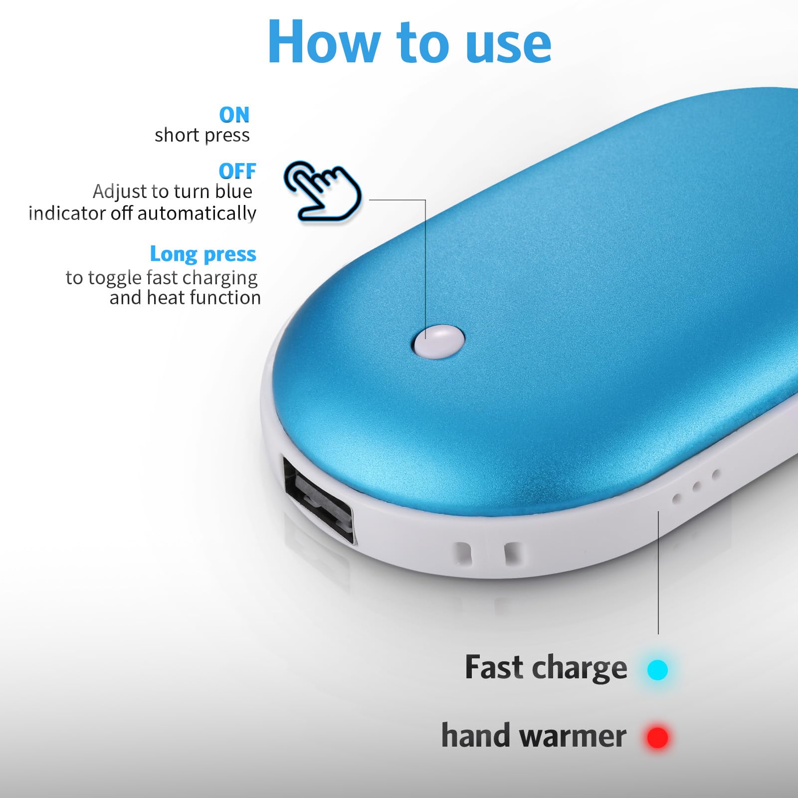 Batterie rechargeable de 5200mAh: Temps de charge : 2~3 heures (recharge par USB-C) Port USB de l'ordinateur Durée de fonctionnement: 4-8 heures ( Il a été testé à une température ambiante de 20℃) Prise de courant Chargeur, Banque d'alimentation, Chargeur de voiture Chaufferette Main Rechargeable Electronique Chauffe Mains USB 5200mAh Power Bank Réutilisable Pourquoi avez-vous besoin de ces chauffe mains rechargeables ? Les hivers insupportables ont disparu ! Une chaleur constante et durable pendant 7 heures à 109°F et 6,5 heures à 115°F à température ambiante (moins dans les périodes plus froides), ce qui le rend idéal pour le camping, le ski... Batterie 5200 mAh avec sortie USB-C (l'adaptateur inclus permet également de charger des appareils USB-A). Regarder des matchs de football, Étudier, Travail de bureau, Travail mécanique Fonctionnement simple avec un seul bouton: Le chauffe main rechargeable électrique peut exécuter toutes les fonctions avec un seul bouton : appuyez longuement pendant 2 à 3 secondes pour activer/désactiver le mode chauffe-mains ; un seul clic pour changer 3 niveaux de chaleur ; double-cliquez pour afficher la puissance restante Un incontournable en hiver froid, en particulier pour les personnes souffrant du syndrome de Raynaud et d'arthrite pour les besoins de thermothérapie Respectueux de l'environnement et sécurité supérieure: Le chauffe-mains électrique est rechargeable et réutilisable, il dispose d'une puce de contrôle de température intelligente intégrée et d'un système de chauffage, qui offre une protection contre les surcharges, les surtensions, les surintensités et les courts-circuits. Cadeau Homme Chauffe Main Rechargeable USB 3600 MAh, Portable Chaufferette Main Sous Gants Chauffants Banque d'énergie 5200mAh, Sortie 10W Chauffe main et banque d'énergie 2 en 1: Peut non seulement vous apporter de la chaleur, mais aussi servir de batterie de secours pour charger vos appareils électroniques en cas d'urgence Chauffe main 3 températures de chauffage réglables Cadeau parfait pour fille, fils, épouse, mari, mère, père lors de fêtes importantes comme Thanksgiving, Noël, la Saint-Valentin Conception compacte qui se glisse facilement dans n'importe quelle poche ou sac Le revêtement en aluminium a une excellente conductivité thermique et des performances de dissipation thermique. Fonctionnement simple avec un seul bouton: Le chauffe main rechargeable électrique peut exécuter toutes les fonctions avec un seul bouton : appuyez longuement pendant 2 à 3 secondes pour activer/désactiver le mode chauffe-mains ; un seul clic pour changer 3 niveaux de chaleur ; double-cliquez pour afficher la puissance restante. Évangile pour le syndrome de Raynaud Indispensable en hiver, en particulier pour les personnes atteintes du syndrome de Raynaud qui ont besoin d'une thérapie par la chaleur Surface lisse La surface de contact est recouverte d'huile de silicone, ce qui rend la main plus lisse et plus douce Chauffage instantané 3s et chauffage double face Description du produit Contenu de la boîte 1 * Chauffe main 1 * Adaptateur (USB-C vers USB-A), 1 * Câble USB, 1 * Sac de rangement, 1 * Manuel d'utilisation La fonction de chauffage est interrompue lorsque le chauffe-mains est en cours de chargement Chauffe-mains rechargeable électrique portable réutilisable double face 5200mAh Banque d'alimentation USB pour dysménorrhée Raynauds Camping Chasse Golf Homme Femme Hiver Meilleur Cadeau (Noir 3 niveaux de température de chauffage réglables : Bas (35°C~42°C), Moyen (42°C~48°C), Haut (48°C~55°C) pour vous donner plus de choix.