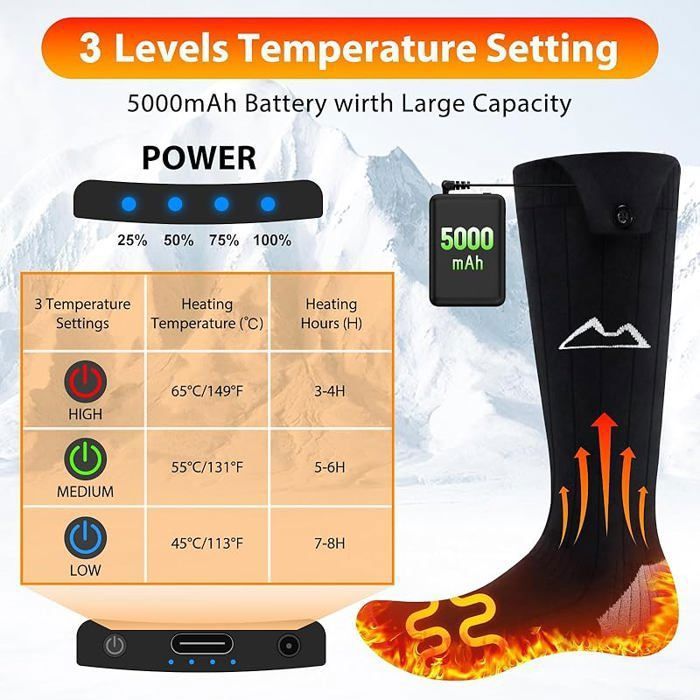 Température moyenne, 45 ~ 50 degrés Celsius. L'élément chauffant aide à concentrer la chaleur sur l'avant-pied afin que vos pieds ne soient pas froids. Améliore la santé et la circulation sanguine : ces chaussettes thermiques peuvent chauffer vos pieds pendant plusieurs heures pour garantir la circulation sanguine et la santé. Trois vitesses : basse température, 35 ~ 38 degrés Celsius. Gilet chauffant USB 3 niveaux de température 9 zones de Contenu : 1 paire de chaussettes., 1 câble USB. Taille : taille taille 36-43., Matériau chauffant : soie en fibre de carbone nano + chaussettes en coton. Contrôle intelligent de la température à trois vitesses : les chaussettes chauffantes à piles ont 3 fonctions de réglage de la température, ce qui rend ces chaussettes électriques très adaptées pour garder vos pieds au chaud en hiver. Description du produit Les chaussettes de cyclisme conçues... Il est très adapté pour les personnes souffrant d'arthrite, d'une mauvaise circulation sanguine et de raideurs articulaires, et favorise la circulation sanguine dans tout le corps. Description : Nom du produit : chaussettes de contrôle de la température., Matériau : chanvre., Genre : unisexe., Âge : adulte. En même temps, le cycle de température empêche vos pieds de mauvaises odeurs et ne vous fera pas mal à vous et votre famille. Chauffe Pied Usb Chaussettes Chauffantes,batteries Rechargeables 2200mAh Avec 3 Niveaux De Chauffage Pour Hiver Le Ski La Randonnee Le Velo Et Les Travaux Exterieurs 98797240 Chaussettes Femme Chauffante Taille : taille unique, taille 36-43 Matériau chauffant : soie nano fibre de carbone chaussettes en coton. Chaussettes chauffantes en fibre de carbone... Gardez vos pieds au chaud et accélère la circulation sanguine.