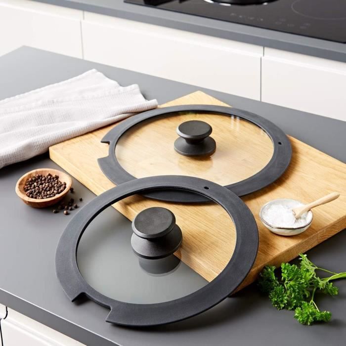 Détails : en verre et silicone pour casseroles de différentes tailles - Diamètre total : env 25,5 cm Jolie | Couvercles universels en verre pour diamètres de 16, 18 et 20... Rebord Silicone étanche Relaxdays 10027987_111 Couvercle Flexible, Verre, Universel, Rebord Silicone, Trou De Vapeur Tefal Ingenio Inox Relaxdays Égouttoir pour la vaisselle, en lot de 2, accueillant 10 assiettes ou couvercles Fonction : couvercle en verre a un trou de vapeur et rebord dégradé en silicone; pas de débordement Universel : Couvercle utilisable pour toutes casseroles et tous poêles - diamètre de 20 à 24 cm
