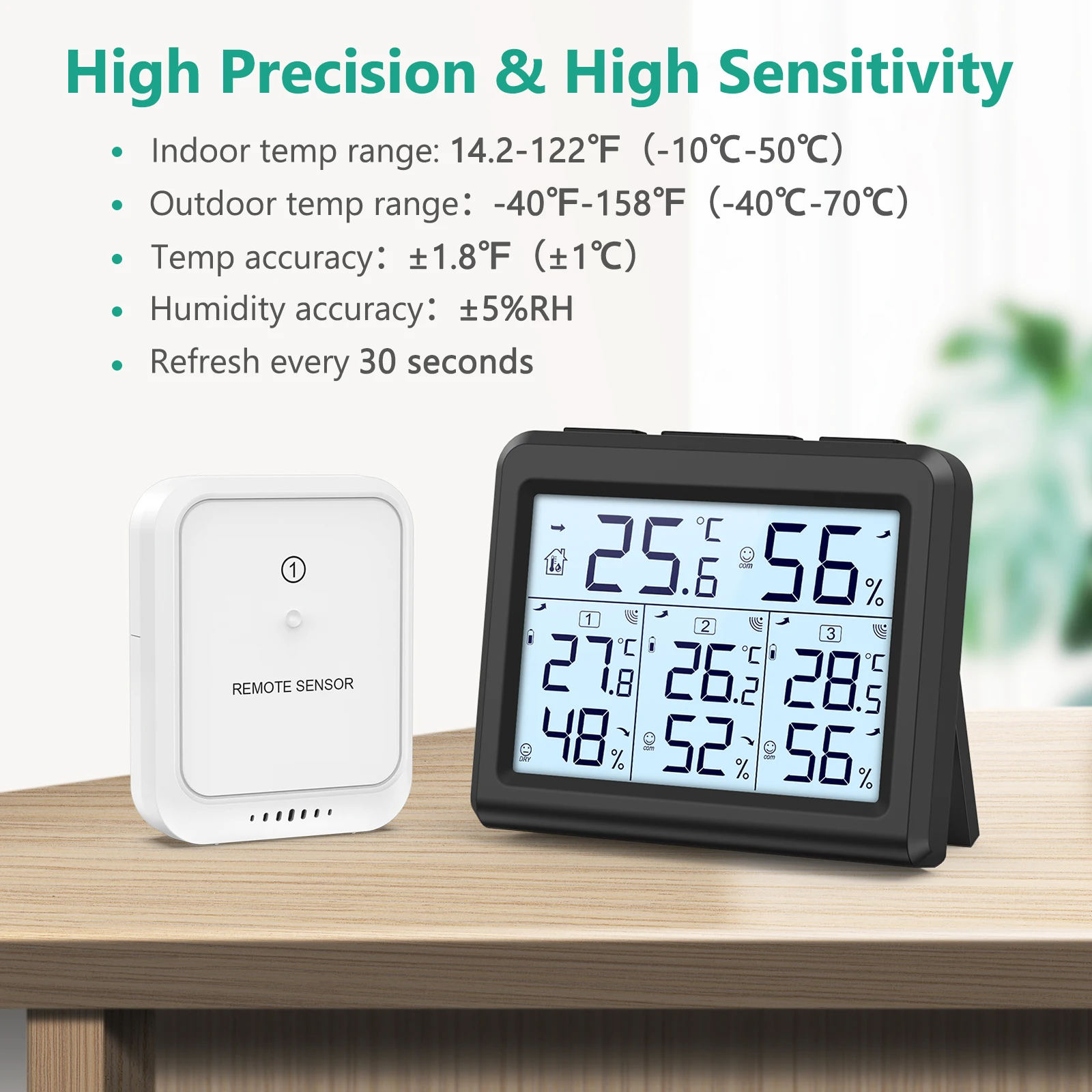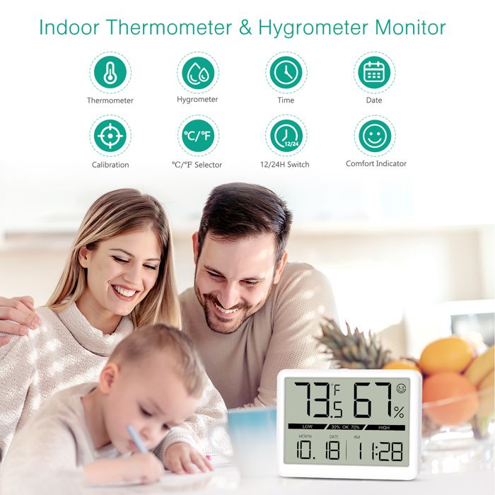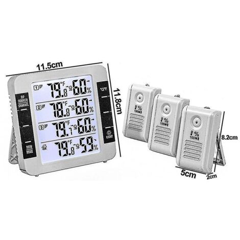 Suivi précis de l'environnement : utilise une technologie de capteur avancée pour fournir des lectures précises de la température (°F/°C) et de l'humidité (% RH), évitant les fausses alertes et garantissant un affichage cohérent des données pour des décisions éclairées sur la ventilation intérieure et les ajustements de confort Capteur Maison Bureau HygromèTre NuméRique Avec Moniteur IntéRieur Et ThermomèTre D'Ambiance Moniteur Qualité Air Intérieur Caractéristiques : * Affichage clair : l'écran LCD numérique offre une excellente visibilité avec de grands chiffres, assure une lisibilité facile à distance, ce qui le rend parfait pour tout environnement intérieur. EJ.life horloge de projection Station météo Horloge Température Humidité Écran couleur LCD... * Dimensions : 108 x 56 x 50 mm., Couleur : blanc, noir. Moniteur de température et d'humidité : suit les enregistrements max et min des conditions de la pièce sur Moment, fournissant un aperçu des tendances climatiques ; pour les utilisateurs soucieux de leur santé visant à maintenir une qualité de l'air intérieur équilibrée et des niveaux de confort tout au long de la journée et de la nuit SHINING HOUSE Thermomètre hygromètre numérique avec rétro-éclairage Lcd, moniteur d'humidité et... * Fonctionnalité polyvalente : avec des fonctionnalités telles que l'affichage de l'heure, l'affichage de la date, les prévisions météorologiques et les fonctions de réveil, il sert à de multiples usages, améliorant son utilité dans divers environnements. * Unités de température : basculez facilement entre Fahrenheit et Celsius en appuyant simplement sur un bouton, permettant une surveillance personnalisée de la température en fonction de vos préférences. Appareil de climatisation d'intérieur multifonction : dispose de fonctions momentanée, date, réveil et prévisions météorologiques sur une seule unité compacte ; construit avec du matériau ABS pour une performance durable et un fonctionnement fiable dans les environnements domestiques ou de travail généraux MARATHON Hygromètre numérique et thermomètre avec * Enregistrement : il suit et affiche les enregistrements maximum et minimum d'humidité et de température, fournissant des informations précieuses sur votre climat intérieur au fil du temps. Design compact avec support mural et plateau de table.