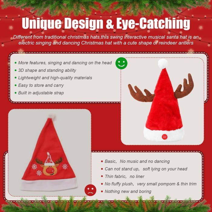 Le diamètre du chapeau est de 7,87 à 9,45 pouces et convient à la plupart des tailles de tête. Peluche fleur chapeau drôle jaune - Univers Peluche ➛Matériau doux : rehaussez l'ambiance festive avec notre chapeau de Père Noël électrique chantant et dansant. Chapeau De Noël Musical Une Femme Dans Une Rouge Robe Et Père Noël Chapeau Nettoie Le Sol Avec Cadeau Noel Adulte Le matériau en peluche de qualité supérieure offre un excellent confort et garantit que les couleurs ne se décolorent pas. Ajoutez une touche de fantaisie à vos fêtes de fin d'année avec ce chapeau de Noël dansant électrique ! Zankie Chapeau de Noël Chantant et Musical - Drôle Chapeau de Fête en Peluche, Rouge et Blanc pour Père Noël, Cadeaux pour Adultes. 11,84 €. sur... Parfait pour les réunions de famille, les spectacles scolaires, les fêtes de Noël/Nouvel An/anniversaire. Matériel: tissu en peluche, composants électroniques La couleur rouge Alimentation : 3 piles AA (non incluses) Taille du produit: 40x20x2 0cm/15,75x7,87x7,87 pouces Poids du produit : 270g Liste: 1 * chapeau de Père Noël électrique Il comporte un chapeau de Père Noël sur une peluche de bureau qui peut bouger et jouer de la musique, ce qui en fait une excellente attraction pour tout rassemblement Parfait pour les fêtes de Noël et du Nouvel An en famille et entre amis, il fera sourire tout le monde. Doux et confortable à porter, il convient à la plupart des tailles de tête. ➛Amusant surprenant : le chapeau de Père Noël électrique avec un spectacle de chant et de danse est prêt à vous surprendre, vous et vos proches, avec ses mouvements et ses mélodies magiques. De conception électrique, il peut se déplacer et jouer de la musique en appuyant simplement sur un bouton. ➛S'adapte à la plupart des tailles : les mouvements synchronisés et la mélodie animée feront sourire tout le monde.