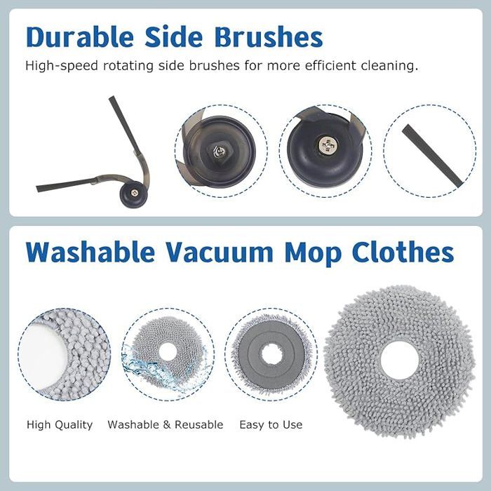 Filtres HEPA : 5 filtres HEPA inclus. 23 pièces incluses: 1 brosse à rouleau, 6 brosses latérales, 6 sacs à poussière, 5 filtres HEPA, 5 serpillères. Veuillez noter que ceci n'est pas un produit OEM. Les poils de nos brosses latérales sont fabriqués en nylon de qualité supérieure, qui sont plus durables et plus propres. Toute utilisation du nom de la marque ou du modèle est uniquement destinée à démontrer la compatibilité de ce produit. Ajustement parfait pour Roborock QV35A/35S : ce kit d'accessoires de rechange est conçu pour correspondre aux performances OEM – Pas de devinettes, juste un ajustement parfait Lavable, réutilisable, durable. Le design structurel innovant de notre brosse latérale QV 35A/QR 798/QV 35S empêche efficacement les cheveux et autres déchets de s'emmêler et améliore la capacité de recueillir les ordures. Kit d'accessoires : 23 pièces incluses: 1 brosse à rouleau, 6 brosses latérales, 6 sacs à poussière, 5 filtres HEPA, 5 serpillères/ Parfaitement compatible avec Roborock QV 35A, QR 798, QV 35S robot aspirateur / Installation facile Roborock Qv35a Roborock Accessoire Lot De 23 Piu00e8ces De Rechange Pour Aspirateur Roborock QV 35A Kit Accessoires Robot Aspirateur Pièces de rechange compatibles avec Roborock QV 35A / QR 798, pièces de robot aspirateur 2 brosses principales, 6 brosses latérales, 4 filtres HEPA, 4 chiffons... Il est parfaitement compatible avec les aspirateurs robots QV 35A/QR 798/QV 35S. Nos sacs à poussière QV 35A/QR 798/QV 35S de dernière version, qui peuvent absorber plus efficacement la poussière et les substances nocives dans l'air. Il est recommandé de remplacer le filtre tous les 1 à 2 mois pour empêcher efficacement la poussière de pénétrer dans le moteur et prolonger la durée de vie du robot aspirateur. Balai ultra épais, verrouillage de l'eau super fort, sortie d'eau plus uniforme, élimination à 99,99 % des taches tenaces, y compris le ketchup, les cendres flottantes, le jus de fruits, la sauce soja, les empreintes de chaussures, les taches de café, les poils de tapis, le riz, le lait, etc. DianSung Zubehör Set für Roborock QV 35A / QV 35S / QR 798 【Serpillière】5 serpillères incluses. Il absorbe également efficacement les poils d'animaux, la saleté, la poussière et les débris, adapté pour les types de sols en bois, tapis ou carrelage. Les lames de grattage sont fabriquées en caoutchouc de qualité supérieure, plus durable et plus propre que les brosses d'autres marques. Le design anti-enchevêtrement de la brosse rouleau QV 35A/QR 798/QV 35S réduit efficacement les problèmes d'enchevêtrement des cheveux.