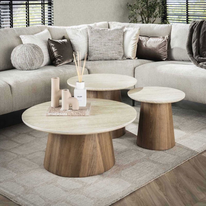 Leur structure en MDF solide assure robustesse et stabilité, tandis que leur design épuré apporte une touche contemporaine à votre salon. HOMCOM Lot de 3 Tables Basses Rondes gigognes encastrables Structure MATÉRIAUX SOLIDES : Structure en MDF robuste et stable, capable de supporter jusqu’à 80 kg au total. Tables MDF Robustes 80kg Lot De 2 Tables Basses Rondes 49 Et 75 Cm Effet Travertin Et Manguier Tables Salon Design Moderne Empilables Avec leur décor imitation travertin, ces tables évoquent le charme naturel de la pierre tout en restant légères et faciles à entretenir. Pratiques et fonctionnelles, ces tables sont empilables, permettant de les ranger aisément ou de moduler leur disposition selon vos besoins. Lot de 2 tables basses rondes empilables décor travertin - MAIA CALICOSY Caractéristiques produit: Lot de 2 tables basses rondes - structure en MDF Décor imitation travertin. Les 2 tables sont empilables. Poids maximum... ENGAGEMENT CALICOSY : Marque française certifiée Bcorp, Calicosy conçoit des meubles durables et responsables, pensés pour embellir votre intérieur. Environ 45 % de sa gamme est fabriquée en Europe, dont 44 % en France. Lot de 2 tables basses L90 cm - MOIRA Certifié Bcorp et engagé pour l’environnement, Calicosy s’engage à être toujours plus responsable. Leur site e-commerce propose plus de 2000 références alliant esthétique et fonctionnalité et toujours conçues pour s’intégrer harmonieusement dans tous les intérieurs. TABLES EMPILABLES : Gagnez de la place grâce à leur design pratique permettant d’emboîter les tables pour un rangement facile. Succombez au charme du lot de 2 tables basses rondes Maia, un ensemble design et raffiné qui s’intègre parfaitement dans les intérieurs modernes et élégants. FORMAT POLYVALENT : Grande table D58 x H38 cm et petite table D48 x H32 cm, idéales ensemble ou séparément selon vos besoins.