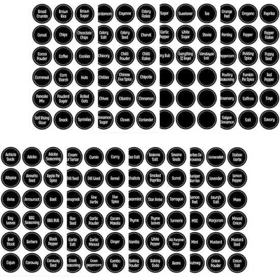 Étiquettes autocollantes rondes avec pictogramme interdiction de fumer En raison de la différence entre les différents écrans, il peut y avoir une légère différence de couleur. étiquettes Pots à épices 342 étiquettes Rondes Amovibles à épices, 304 Graines D'herbes Pré Support Cuisine Remarque : En raison de la mesure manuelle, la taille et le poids peuvent avoir une certaine erreur. SAVITA 144pcs 1,5inch Étiquette Pot à Épices, Étanches Autocollants... Dimensions · 13,5 x 26,7 cm ; Matériau · PVC autocollant ; Compatibilité et accessoires. Comprend 9 feuilles d'autocollants vierges pour créer vos propres... Large application : les autocollants pour bouteilles d'épices peuvent non seulement vous aider à organiser votre cuisine, mais également les 54 autocollants vierges sont adaptés pour toute la maison, y compris le réfrigérateur, la buanderie, le stockage, la salle de bain, le placard, les fournitures de nettoyage et le bureau. Le produit comprend : vous recevrez 432 pièces/12 feuilles d'autocollants d'étiquettes de cuisine, y compris 378 étiquettes à épices non répétées et pré-imprimées et 54 étiquettes vierges, parfaites pour garder vos épices de cuisine propres et votre garde-manger bien rangé Très utile pour organiser votre maison Détails du paquet : 432 pièces/12 feuilles d'étiquettes de garde-manger de cuisine. Forte adhérence : les étiquettes de conteneurs à épices sont pré-imprimées sur des autocollants de qualité supérieure avec une forte adhérence, pas faciles à déchirer ou à décoller, pratiques à remplacer, et ne laissent pas de résidus après le retrait, de sorte que vous n'avez pas à vous soucier de les coller à la mauvaise bouteille. Caractéristiques : Couleur : noir.
