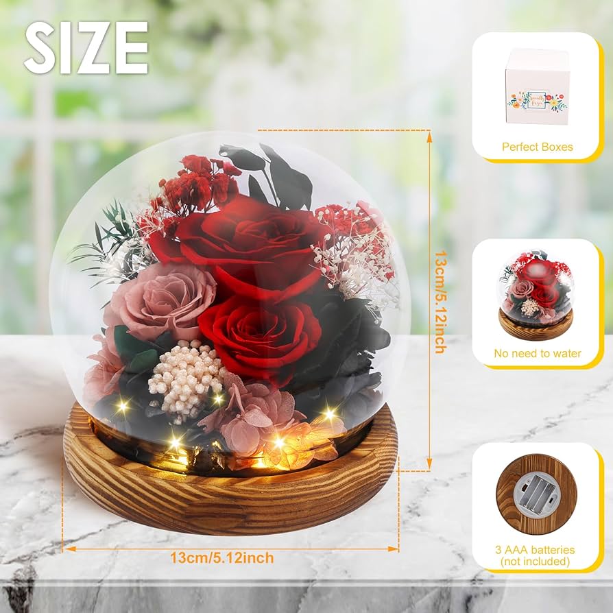 C'est un cadeau parfait pour la Saint-Valentin, la fête des Mères, les anniversaires et les mariages, pour exprimer votre amour à vos proches Cloche Verre Avec Lumière Rose Eternelle Sous Cloche, La Belle Et La Rose, Fleur Eternelle Avec Cadeau Romantique Fête Des Mères Anniversaire Transparent et clair, il est également robuste et durable. Rose éternelle sous cloche XL - Dame Nature 💖Décoration d'intérieur exquise: Alimentée par 3 piles AAA (non incluses), lorsque l'interrupteur du bas est allumé, la lumière illumine la fleur, créant une atmosphère romantique. 🌟Un symbole de belle signification: La rose éternelle bleue et dorée dans le dôme en verre symbolise le véritable amour, ce qui en fait un cadeau parfait pour les amoureux, la famille et les amis pour exprimer leur affection et leur reconnaissance. Winthai Rose Eternelle sous Cloche, La Belle et la Bête Fleurs... 🌹Rose éternelle: Fleurissant dans un dôme en verre transparent, cette rose véritable de haute qualité conserve sa fraîcheur pendant des années, ce qui en fait non seulement un cadeau romantique, mais aussi un souvenir impérissable 🎁Coffrets cadeaux et cartes de vœux raffinés🎁 Nous proposons des coffrets cadeaux et des cartes de vœux raffinés, parfaits pour offrir des cadeaux élégants en toute sérénité. 🎀Cadeau romantique exquis: Livré avec un coffret cadeau raffiné et une carte de vœux. Rose Éternel,Naturelle Fleur Eternelle sous Cloche avec Lumière LED 🎀Idéal pour toutes les occasions et fêtes🎀 Parfait pour exprimer votre amour ou vos meilleurs vœux à l'occasion de la Saint-Valentin, de la Fête des Mères, des anniversaires et des mariages. Cette rose éternelle bleue et dorée peut être offerte directement à vos proches sans emballage supplémentaire.