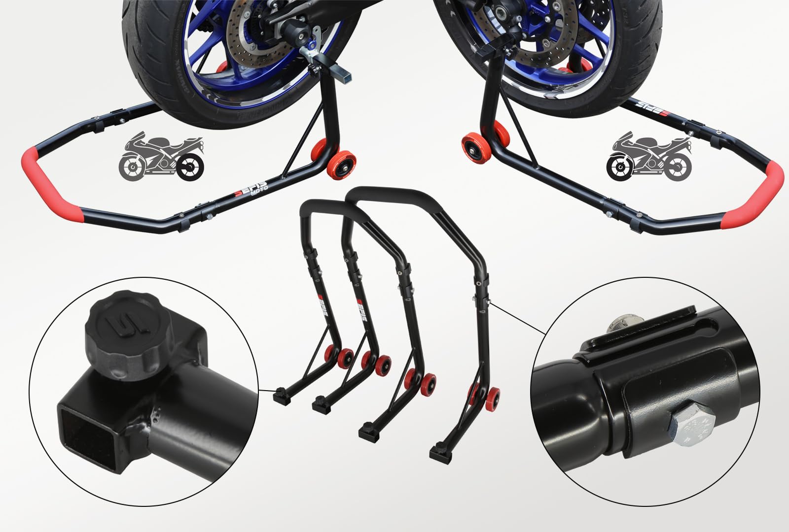 Support Montage Moto Charge 200 Kg SEFIS D18 Motorradständer Hinterrad - Rot - Für Honda CMX 500/1100 Béquille Moto Arrière Réglable Pwshymi Porte-bagages de moto Porte-bagages arrière de moto, Support de SEFIS D18 moto stojan predný a zadný set - čierný pre Honda CMX 500... Convient à la plupart des motos Profilé en tube d'acier solide de 32 mm - Construction renforcée - Charge maximale : 200 kg par côté de la moto Insert pour stylo de service (stylo non inclus, peut être acheté séparément) démontable pour le transport et le stockage. Levage de moto arrière à bascule pour remorque de moto arrière - Béquille arrière de moto - Béquille de montage arrière de moto - Béquille de moto - Support de montage arrière - Support de moto - Support central de moto - Chaînes max - Plateforme de moto - Cric arrière - Support de moto - Support de moto - Support de moto - Support avant béquille moto moto Support à roulettes de moto, bascule, remorque, cric de moto, support de montage avant Instructions en allemand dans l'onglet de téléchargement (français non garanti) Nous vous recommandons la béquille avant D18 avec adaptateur mandrin – voir photo. Contenu : 1 support de moto et adaptateur pour Honda CMX 500/1100 Rebel Le support D18 dispose également d'une poignée caoutchoutée pour une meilleure prise en main et un confort remarquable lors de la manipulation
