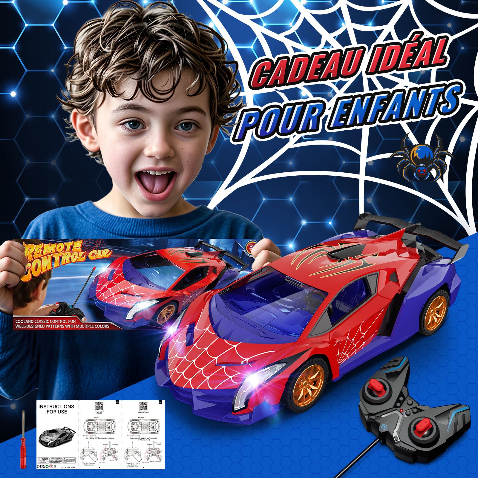 Voiture Thème Araignée Dinosaure Voiture RC 4x4 Voiture Télécommandée Tout-terrain 4x4 - Rotation 360° - 2,4GHz - Rechargeable - Enfants 3-12 Ans - Cadeau Cadeau Garçon Stunt Car Voiture Télécommandée Araignée Dinosaure Dreamlandia Spider Voiture Télécommandée Jouet Enfant 3-10 Ans EXOST Voiture Télécoandée Tout-Terrain - 360 Cross 2,4Ghz - Conduite... Elle est disponible en version araignée et dinosaure et dispose de lumières LED sympas qui procurent aux enfants de 3 ans et plus un plaisir et des surprises sans fin. Profitez d'environ 30 minutes de plaisir de conduite. La télécommande nécessite 2 piles AA (non incluses) qui peuvent être facilement remplacées, vous permettant de profiter d'un plaisir de conduite ininterrompu. 🚗[Voiture Télécommandée Pivotant à 360°] Cette voiture télécommandée est équipée d'un essieu avant pivotant à 360 degrés et de gros pneus, ce qui lui permet d'effectuer sans effort d'impressionnants virages à 360 degrés. 🎮[Technologie Sans fil 2,4 GHz] Ce monster truck télécommandé est équipé de la technologie 2,4 GHz, ce qui permet à jusqu'à 10 amis de s'affronter simultanément sans interférence mutuelle. 🎁[Le Cadeau Idéal] Un jouet divertissant pour les enfants à partir de 3 ans, emballé dans une boîte cadeau colorée qui peut être envoyée directement comme cadeau. Le cadeau idéal pour les enfants. Elle bouge dans tous les sens, fait des rotations à 360° et roule très bien sur différentes surfaces comme le carrelage, le tapis ou même dehors sur la terrasse...