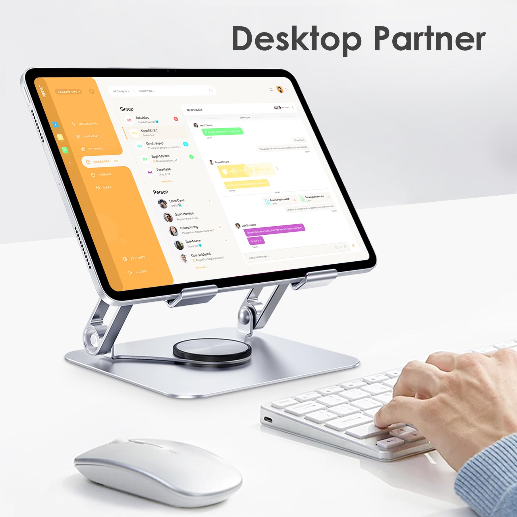 Du travail au bureau au chevet d'une série TV dans la chambre, des loisirs et divertissements au café à un établi temporaire en déplacement, ce support offre une expérience utilisateur optimale. Support Liseuse Support De Tablette, Support De Tablette Réglable Avec Base Rotative A 360 Support De Tablette Pliable Universel En Aluminium Pour Tablette Smartphone Support Tablette Lit Fabriqué en Alliage : Ce support de tablette pliable rotatif à 360 degrés est fabriqué en alliage haute résistance, à la fois léger et robuste, offrant un support fiable pour les tablettes. Sipeak Support Téléphone, Support Tablette, Support Dock pour... La conception de l'anneau magnétique est compatible avec les chargeurs sans fil courants. La surface de base de 13,5 cm × 11,5 cm (5,31 po x 4,5 po) offre un équilibre parfait entre stabilité et encombrement. Rotation à 360° - Ce support pour tablette est doté d'une base pivotante à 360°, facilitant son utilisation d'une seule main.Pliable et réglable en hauteur - Ce support convient aux tablettes de 4 à 16 pouces. Grâce à sa conception à double articulation et à ses deux axes de rotation à 180°, il offre un réglage flexible de la hauteur, soulageant efficacement les tensions au... Dissipation Thermique et Charge Magnétique : La structure poreuse de dissipation thermique du déflecteur améliore efficacement l'efficacité de la dissipation thermique de la tablette et prévient l'impact des températures élevées sur ses performances. Rotation Multidimensionnelle : Le produit intègre une structure rotative à trois niveaux. La largeur du déflecteur de 12,5 cm (4,92 po) assure un maintien stable sans bloquer les boutons ou les interfaces de l'appareil. KUXIU X44PRO support de chargement magnétique sans fil pour iPad avec Base rotative à 360 degrés pour iPad Pro11/13 pouces M4 (2024), support de tablette pliable Le disque rotatif à 360 degrés situé en bas permet d'ajuster librement l'orientation horizontale de l'écran ; la tige de support centrale et le déflecteur permettent un réglage de l'inclinaison à 180 degrés vers l'avant et l'arrière. Ces conceptions permettent au produit d'atteindre une valeur fonctionnelle maximale dans un volume limité.