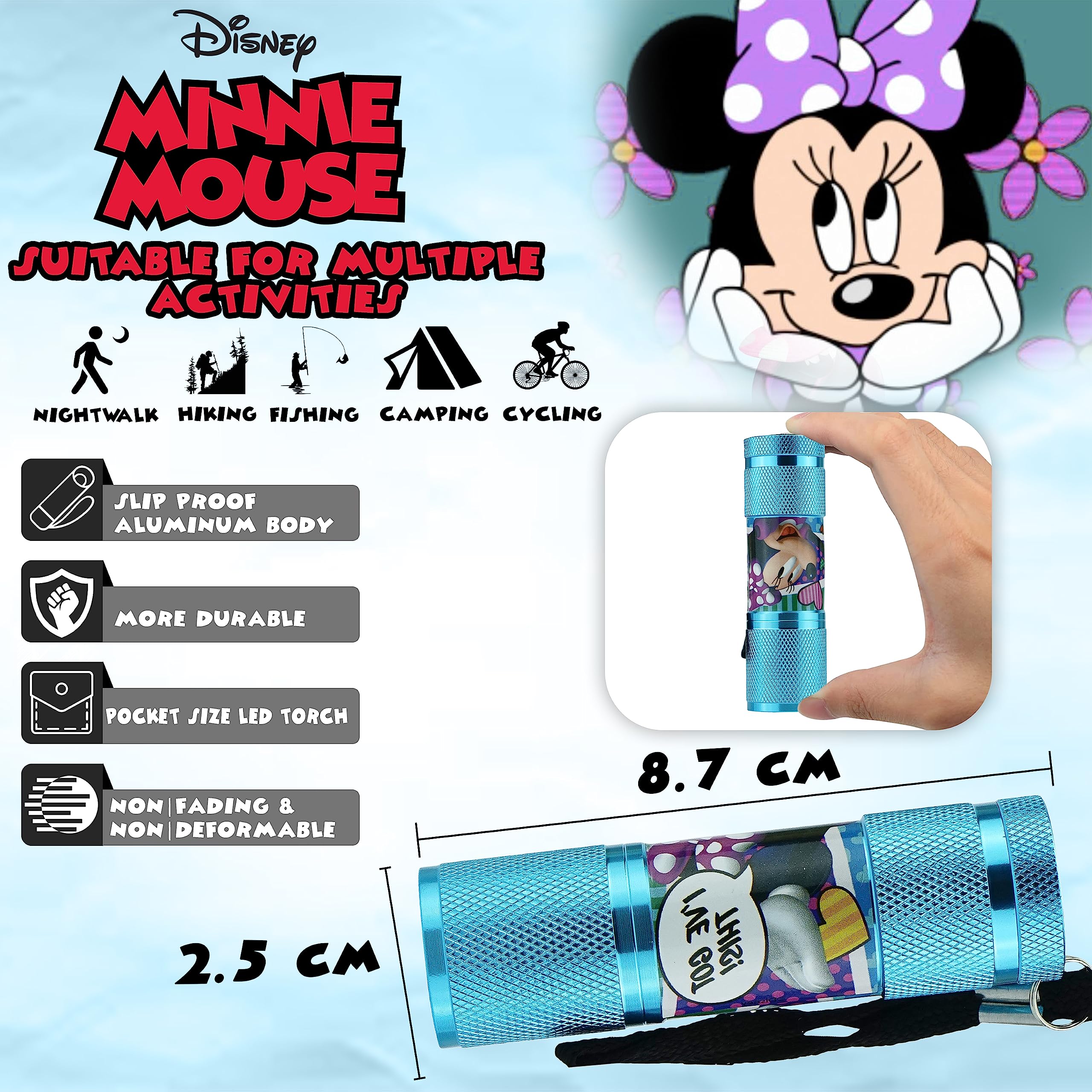 Design résistant à l'eau. Ce matériau est inodore et durable. N'importe quel petit homme adorerait cette lampe torche polyvalente tendance, de sorte que vous ne pouvez pas vous tromper avec la lampe torche en aluminium si vous voulez surprendre votre fils, neveu, petit-fils ou filleul. Lampe De Poche Enfant Résistante à L'eau Lampe Torche Rouge Minnie Mouse, Lampe De Poche LED En Lampe Torche Enfant Minnie Mouse C'est un très bon matériau en aluminium qui durera longtemps. Cette lampe torche fonctionne avec 3 piles AAA (non fournies). Pour toute question, n'hésitez pas à nous contacter, nous vous donnerons une réponse satisfaisante dans les 24 heures. Cette lampe de poche est conçue de telle sorte qu'elle assure une prise en main sûre et confortable dans toutes les situations. Lampe de poche pour enfants jouant dans l'obscurité. Mouse Lampe | Marcantonio Art & Design | KiKi Lighting Contenu de l'emballage : 1 lampe torche Minnie Mouse à 9 LED rouges en aluminium. Il est de forme ronde et a de beaux personnages de télévision. Lampe torche résistante à l'eau : la poignée antidérapante rend cette lampe de poche parfaite pour une utilisation sous la pluie, la neige ou d'autres situations d'urgence. Le matériau en aluminium assure durabilité, haute résistance et résistant à la corrosion. Lampe torche rouge pour la chasse, lampe de poche de chasse au porc... Il est simple d'allumer et d'éteindre en appuyant sur un seul bouton marche/arrêt. Il est facile à transporter et à utiliser et fonctionne parfaitement en toutes saisons. Prise en main confortable, facile à utiliser avec une seule main. La petite lampe torche à 9 LED est spécialement conçue pour fonctionner dans des conditions difficiles. Caractéristiques : Âge : 3 ans et plus., Quantité : 1 pièce., Matériau : aluminium., Luminosité : 45 lumens., Nombre de piles : 3., Nombre de LED : 9., Dimensions : 8,7 x 2,5 cm. La portée lumineuse effective [distance lumineuse] est d'environ 10 mètres. Lampe torche LED fabriquée en aluminium. Lampe de poche avec interrupteur marche/arrêt doux. Type de pile : 1,5 V AAA (non incluse). ✅ Beau design : cette lampe torche pour enfants est conçue d'une manière belle et attrayante qui est acceptable pour tous les enfants. Convient pour une utilisation en extérieur ou en intérieur, comme lampe de poche d'urgence, outils à main, lampe de poche de camping, gadgets de voiture pour homme ou comme sauvegarde à la maison. Offrez aux enfants un sentiment de sécurité la nuit. Crochet intégré à l'arrière pour une suspension facile. Dimensions et matériau : longueur de la lampe torche LED : 8,7 cm, diamètre : 2,5 cm. ✅ Utilisation : cette lampe torche légère et portable en aluminium est résistante aux intempéries et parfaite pour la maison, les voyages, la chasse, la randonnée, le cyclisme, le camping, les activités de plein air et les urgences ou tout simplement pour avoir sur votre clé. Lampe torche et veilleuse GoGlow Disney Minnie Mouse ... Cet article n'est malheureusement plus disponible. ... Vous n'avez pas trouvé ce que vous cherchiez ? En...