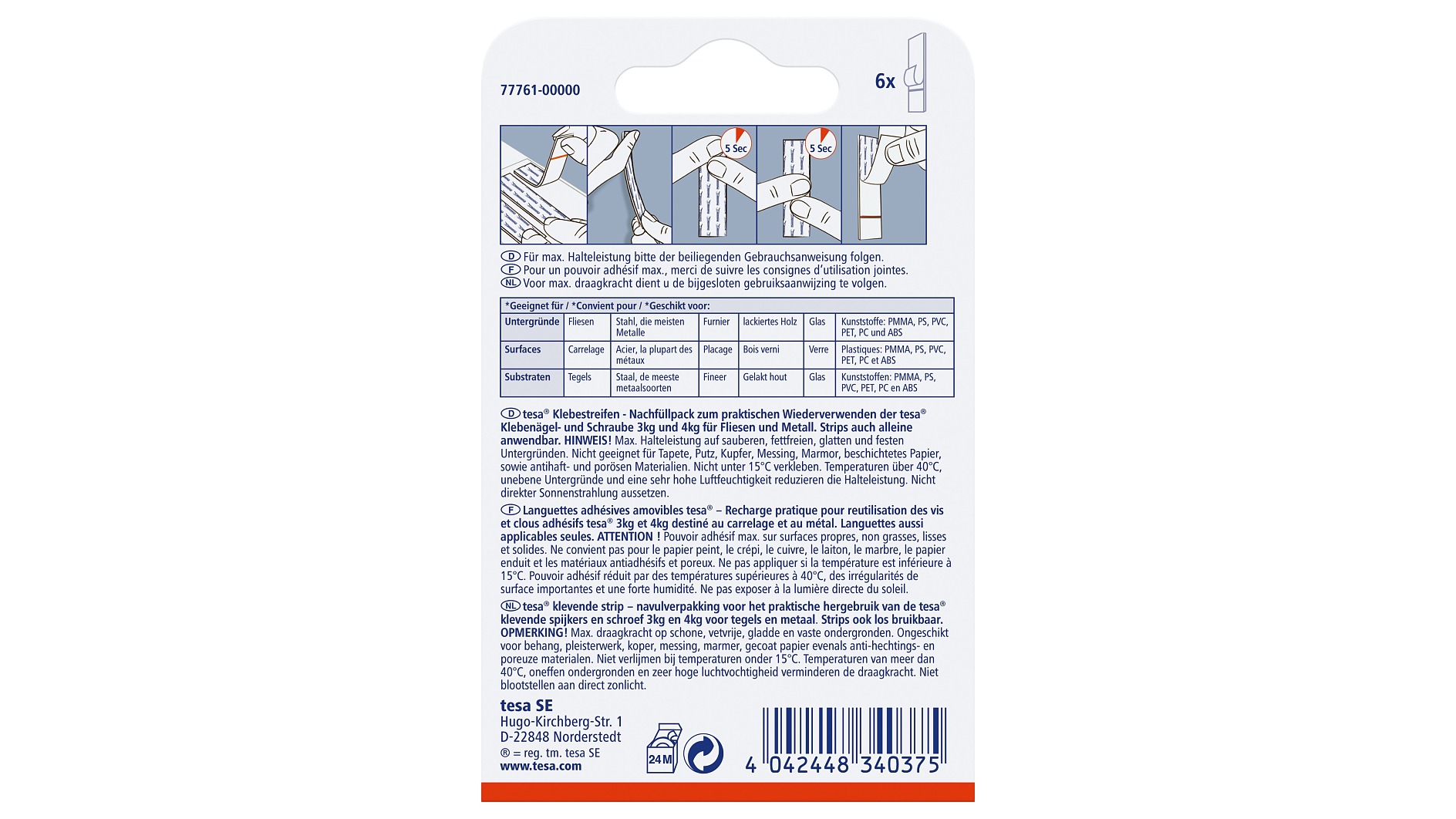 et systèmes adhésifs, et représente des produits innovants et de haute qualité. Recommandé pour ceux qui veulent éviter les trous peu attrayants et les dommages au mur. Fixation Sans Perçage 3 Kg Utiliser Le Ruban De Fixation ® Pour Le Carrelage Et Le Métal 100 Kg/m Ruban Powerstrips Double Face TESA Double-face de fxaton - Pour le carrelage & le métal | Fxaton... Caractéristiques du produit : Fixation adhésive sur des surfaces lisses et fermes. Alternative parfaite aux vis et autres méthodes conventionnelles, le clou adhésif est adapté pour les applications sur le carrelage et le métal. Les bandes innovantes double face offrent des solutions de suspension rapides et simples, sans perçage ni dommage pour votre maison. Se retire sans laisser de traces. Réutilisable avec les nouveaux tesa Powerstrips. Élimine les trous gênants ou le martelage dans les murs. tesa offre aux ménages des centaines de solutions innovantes de fixation, montage, emballage, rénovation, réparation, isolation et protection contre les insectes, la poussière et les courants d'air. Technologie adhésive tesa Powerstrips : la solution pour accrocher des générations modernes. Pour surfaces intérieures lisses et solides comme les carrelages. Pour objets jusqu'à 3 kg par support ou 6 kg sur 2 supports. Se retire sans laisser de traces Capacité de charge : 3 kg par cloutesa - plus que du ruban adhésif tesa est l'un des principaux fabricants de Ruban adhésif de qualité mondiale. Pour surfaces intérieures lisses et solides comme les carrelages. Sa facilité d'installation et de démontage sans laisser de traces font de cette solution intelligente tout-terrain une solution unique pour la fixation. tesa Packband Hotmelt 04280-00001-00 braun