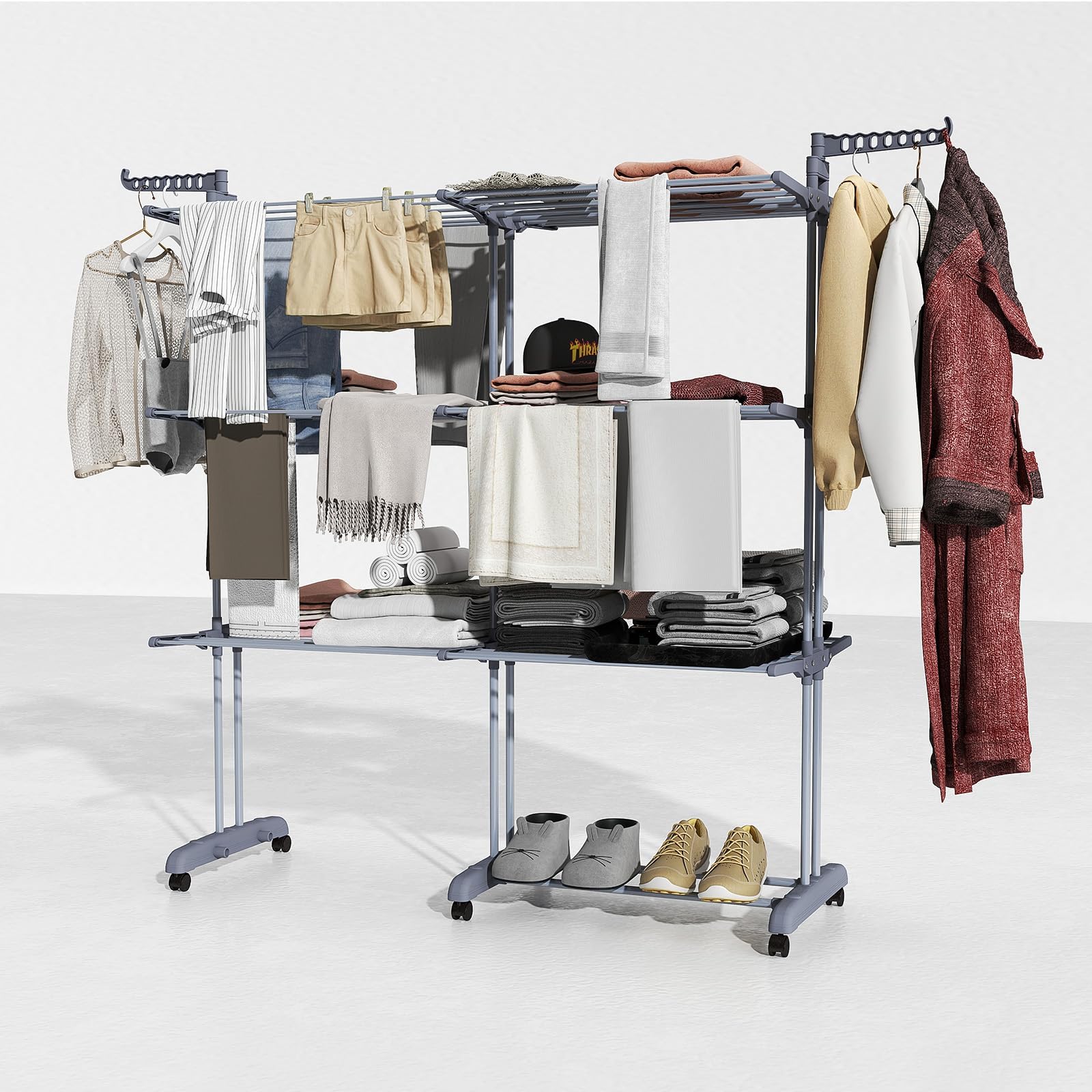 Porte-manteau Mobile Métal Séchoir à Linge Vertical Télescopique, Réglable, Extensible, 94 Cm Séchoir à Linge Costway Etendoir Linge Interieur Pliable, Sechoir A Linge À Trois Couches Avec Hengda Séchoir à linge pliable & télescopique réglables barre télescopique Séchoir Mobile à 4... Paramètres du produit. Matériau du produit : tube en acier inoxydable + tube en acier pulvérisé en plastique + plastique pp Taille du produit : 84-150 x 42 x 108-70cm (rétractable) Réglable : longueur de 84 cm à 150 cm / hauteur de 108 cm à 170 cm Liste des produits : Support de séchage1 Instructions de montage1 ✨Portant à Vêtement-La hauteur et la largeur peuvent être ajustées en fonction de vos besoins. Caractéristiques: La conception à double tringle peut accueillir deux fois plus de vêtements pour répondre à vos besoins de la vie. ✨Bien organisé-les vêtements en désordre sont instantanément décorés dans un vestiaire. ✨Déplacement facile-grâce à ses 4 roulettes, il peut être déplacé facilement dans n'importe quel coin. ✨Soins après-venteSi vous n'êtes pas satisfait de l'un de nos produits, fournissez-nous des photos et nous avons une équipe après-vente professionnelle pour vous fournir la meilleure solution Ce portant à vêtement est réglable aussi bien en hauteur (de 108 à 170 cm) qu'en longueur. Les barres de pendaison sont extensibles de 84 à 150 cm pour suspendre plus de vêtements