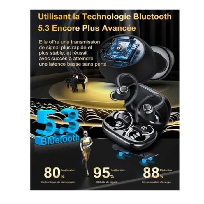 De plus, ces écouteur sport sont équipés de la technologie de réduction de bruit ENC pour les microphones. Avec une portée stable allant jusqu’à 10 mètres, vous bénéficiez d’une expérience audio fluide et fiable en toute situation. Profitez d’une liberté sans fil intuitive et immédiate. Son Immersif & Appels Cristallins: ces écouteurs sans fil 100 % sans fil sont dotés de haut-parleurs dynamiques hautes performances de 14,2 mm pour une expérience sonore stéréo immersive, offrant des basses profondes, des médiums fluides et des aigus cristallins. 40 Heures Ecouteurs Bluetooth Open Ear Contrôle Tactile, Écouteurs Même dans des espaces publics bruyants ou en déplacement, vos appels restent clairs et fluides, garantissant une communication efficace à tout moment et en tout lieu., Bluetooth 5., 4 & Appairage Rapide: Ces ecouteurs sans fil open-ear intègrent une puce Bluetooth 5., 4 avancée, offrant une connexion 50 % plus rapide, une résistance aux interférences 65 % supérieure et une efficacité de transmission des données améliorée de 75 % par rapport aux versions précédentes. Ils restent fermement en place, que vous couriez, travailliez ou soyez en déplacement. Ecouteurs Bluetooth Sans Fil, Écouteurs Bluetooth 5.3, Oreillette Bluetooth Hifi Stéréo Avec 4... Inutile de sortir votre téléphone, vous contrôlez librement votre rythme pendant l'entraînement. 58H d'Écoute Ininterrompue: Avec jusqu'à 8 heures de lecture musicale ou d'appels en continu sur une seule charge, plus 50 heures supplémentaires de batterie dans l'étui de charge, ces écouteurs bluetooth sans fil offrent une autonomie totale allant jusqu'à 58 heures. Dès que vous les retirez de leur étui de charge, les casque bluetooth sans fil s’allument automatiquement et entrent en mode appairage. Casque Sans Fil Léger Course SANOTO Open Ear Écouteurs Bluetooth 5.3, Contrôle Tactile - Sans Fil Autonomie 58h étanche Ipx7 Smart Touch, IPX7 étanche : les écouteurs sans fil Bluetooth ont un algorithme tactile précis pour éviter efficacement les mauvais opérations. Il suffit de toucher du bout des doigts pour régler le volume, changer de piste et répondre aux appels D'une simple pression du doigt, vous pouvez changer de morceau, ajuster le volume, répondre/terminer un appel ou activer votre assistant vocal.