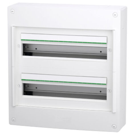 R9H18421M - Resi9 - porte touch miroir coffret 18M - 1R | Schneider-electric Suis Caractéristiques principalesGamme de produits : OpaleFonction produit : BoîtierType de coffret : Boîtier de distributionNbre de modules 18 mm par rangée : 18Nbre de rangées horizontales : 1Équipement fournis : Bloc terminal mis à la masse / neutre ( 1 )Obturateur ( 1 )Kit de marquage ( 1 )Normes : IEC 60439-3IEC 60529IEC 60695-2-11Labels qualité : NFLargeur : 357 mmHauteur : 235 mmProfondeur : 111 mmCaractéristiques détailléesInstallation du coffret : En saillieNombre total de modules de 18 mm : 18Nombre de plaques : 5 pour 18 mm divisibleIn courant assigné d emploi : 90 AType de rail : DINEntrée de c ble : 4 prédécoupesCompatibilité du bloc de distribution et peigne de JdB : Compatible XENombre de borniers : 1 terre bornier avecDéparts du bornier répartiteur : 4 x 25 mm² pour terre20 x 2., 5 mm² pour terreMatière du coffret : Matériau auto-extinguibleCouleur : Boîtier : blanc ( RAL 9003 ) Boîtier électrique 18 Modules SCHNEIDER 13394 - Mini Coffret Opale En Saillie - 4 Modules Boîtier électrique 357x235x111 Mm Coffret Mini Opale 1 rangée schneider 4 modules 13394 Mini coffret Schneider Opale 8 modules - 13398 13398 SCHNEIDER | Bâtir...