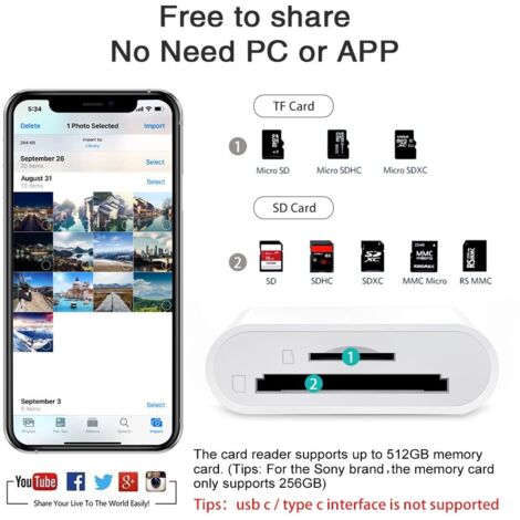 Lecteur de Carte SD pour iPhone / ipad / Android / Mac Lecteur de carte micro SD / TF OTG avec un port USB Type-C, compatible avec MacBook, Samsung Galaxy Note 20, S21, S20, S10, S9, S8, M52, A72, A52s, A32, A22... Lecteur Carte Sd Usb C Card Reader Carte Memoire UGREEN Lecteur De Carte SD USB C 3.1 Micro SD Adaptateur De Carte Mémoire Pour SDXC SDHC, MMC, RS-MMC, Micro SDXC SDHC Compatible Avec IPhone 15 MacBook IPad Lecteur Carte Mémoire 4 En 1 Description du produit Le lecteur de carte sd usb avec port usb/usb c (type c)/micro usb/charge pour iPhone/iPad (pour les utilisateurs d'Android, veuillez vous assurer que votre fonction OTG a été ouverte) Et le lecteur de carte SD ajoute un port de charge, la charge et la lecture de carte peuvent être utilisées en même temps Compatibilité : le lecteur de carte SD/micro SD prend en charge tous les iPhone avec iOS 8., 0 et plus et les iPad avec iOS 8., 0 ou plus récent/téléphone Android OTG, ordinateur et autres appareils avec port USB. Lecteur de Carte SD/Micro SD pour i-Phone/i-Pad/Android/Mac/Ordinateur/Appareil Photo, Lecteur de Carte mémoire Portable 4 en 1 Adaptateur de Carte et caméra de... Interface multiple 4 en 1 : le lecteur de carte mémoire dispose de plusieurs interfaces : USB / USB C (type C) / fente pour carte micro USB / SD / port de charge des appareils iOS pour iPhone/iPad, transférez facilement le fichier dont vous avez besoin entre différents appareils. Capacité maximale de la carte mémoire : 400 Go Petit et portable : le design fin et élégant + le design porte-clés permet au lecteur de carte SD d'être placé dans votre poche, évite de perdre et de transporter l'adaptateur de carte micro SD avec vous Partage et gestion des données en temps réel : transmission bidirectionnelle haute vitesse, le lecteur de carte SD pour iPhone convient pour la transmission de données entre iPhone/Android/ordinateur et autres appareils, fournissant des fonctions de visualisation et de gestion intelligentes des fichiers, naviguer des documents, images, regarder des vidéos, écouter de la musique, etc.