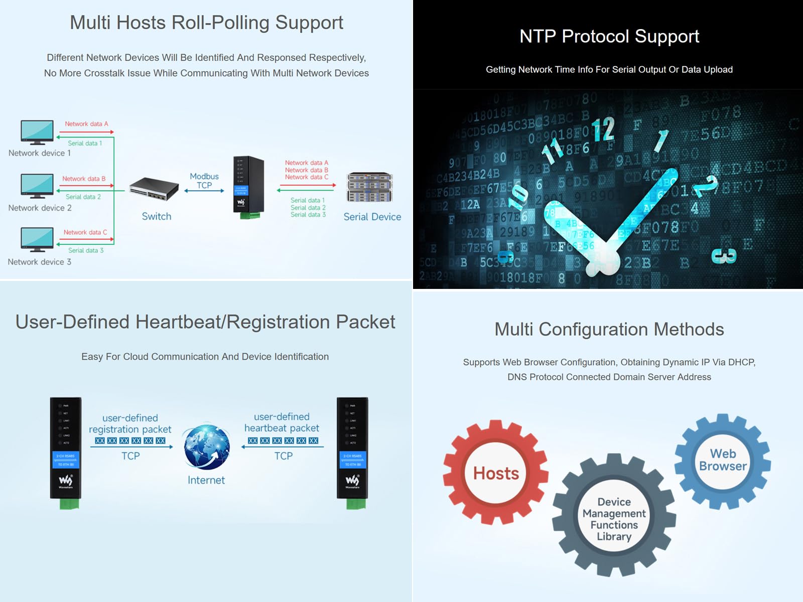 Convertisseur Industriel Isolé Tcp Ip Converter SERVIDOR SERIE INDUSTRIAL RS485 A WIFI/ETHERNET - MODBUS MQTT GATEWAY Waveshare RS232/485/422 To RJ45 Convertisseur RS485 Ethernet Convertisseur Rs232 Vers Rs485 Accessoires Cctv - Buy Onduleurs Et Serveur série RS485 vers RJ45 POE 2 canaux 2 ports Ethernet - Waveshare - 2-CH RS485 TO POE ETH... Support Ethernet Port Cascade, onboard 2-ch Ethernet Ports for communication and cascade, either one can be used for dual serial server network communication, while the other one can be used for cascading or communication with other devices Support screw terminal and DC power port for power supply, DC 6~45V, wide voltage range input Multi hosts roll-polling support. Overview 2-Ch RS485 to RJ45 Ethernet Serial Server, Dual channels RS485 independent operation, Dual Ethernet Ports, Rail-mount Industrial Isolated Serial Module, Bi-directional Transparent Transmission. User-defined heartbeat/registration packet., NTP protocol support., Multi configuration methods Multiple protection, safe and stable, onboard power supply and signal isolation, built-in TVS and resettable fuse and protection diode etc. Rail-mount support, industrial-grade rail design, compact size, easy installation, cost-effective Le module comporte deux ports RS485 et deux ports Ethernet (fonction PoE en option), utilise un port CC (diamètre extérieur : 5,5 mm, diamètre intérieur : 2,1 mm) et une borne à vis pour l'alimentation. Le boîtier avec support de montage sur rail est de petite taille, facile à installer et économique