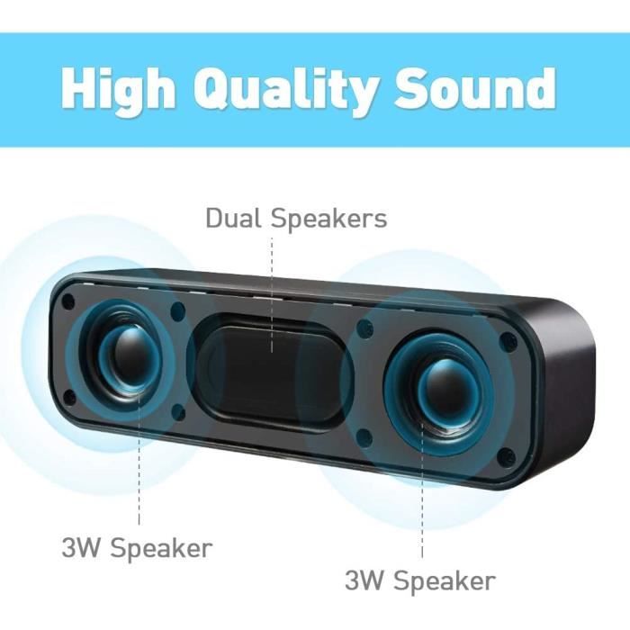 Mini-barre de son pour ordinateur portable, haut-parleurs Haut-parleurs d'ordinateur portables alimentés par USB Mini haut... Barre De Son PC Portable 2.0 BARRE DE SON Portable Haut-Parleurs D'Ordinateur AUX Filaire Haut Alimentation Pc Description du produit Mini haut-parleur: petit et exquis, seulement 85 * 30 * 42mm Mini haut-parleur USB portable pour ordinateur portable, économisant de la place et vous offrant un bureau bien rangé. Ce haut-parleur de barre de son d'ordinateur peut parfaitement tout ordinateur et rendre votre maison votre maison élégante. Haut-parleur PC, haut-parleur Bluetooth 5.3 USB 2.0, barre de son... 【Excellentes performances sonores】 : Combinée à deux haut-parleurs puissants de haute qualité, cette barre de son a une fantastique performance sonore entourée de stéréo 3D, plaçant de manière flexible la mode et la conception portable convient à tout appareil USB. 【Facile à utiliser】 Il suffit de brancher sur un port USB disponible et de profiter du son stéréo riche. 【Conception compacte et mince】 Mini taille (3,9x3x1,2 pouces), livré avec une taille peu encombrante sont conçus et fabriqués pour remplir votre bureau, votre espace d'étude ou tout autre recoin de la maison avec de la musique, des films, des jeux, un livre audio ou conférences en ligne à l'aise Conseils: le haut-parleur USB de l'ordinateur n'a pas de bouton de volume