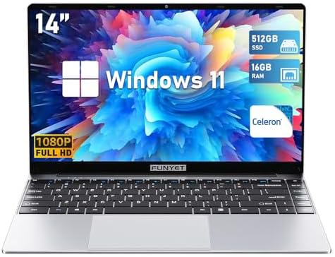 Ordinateur étudiant FHD FUNYET Ordinateur Portable 16 Pouces Win 11 Pro 16 Go RAM 512 Go SSD PC Portable CPU Celeron N150 Jusqu'à 3.6 GHz 6000mAh Battery Laptop 1920×1200 USB 3.0 BT 5.0 WiFi 5 Mini-HD Clavier Rétroéclairé Ordinateur Gaming N150 Portée Améliorée et Utilisation Plus Silencieuse]L'ordinateur portable est doté d'une batterie de 6000 mAh qui optimise l'autonomie et améliore les performances, ce qui le rend idéal pour un mode de vie décontracté en déplacement FUNYET 16 Pouces, processeur N150 (jusqu'à 3,4 GHz), 16 GB 【Longue Durée de Vie de la Batterie & Fiabilité】Batterie 6000mAh améliorée offrant 6 heures d'utilisation, Win 11 Pro pour une sécurité, une vitesse et une compatibilité accrues. FUNYET avec écran Tactile, Windows 11 Pro, 14 Pouces 2 en 1, Core i7... Comprend 1 an de service après-vente + service client 24/7 pour une possession sans souci. 【Conception Ultra-portable】Pesant seulement 1,6 kg avec une épaisseur élégante de 2 cm, il combine la mobilité avec une configuration à grand écran. Parfait pour les professionnels et les étudiants en déplacement, il se glisse sans effort dans les sacs sans compromettre les performances. 【Performances Inégalées】L'ordinateur portable est doté d'un processeur Celeron N150 de 12e génération à 4 cœurs et 4 threads avec des vitesses allant jusqu'à 3,6 GHz, qui gère en toute transparence les tâches de travail intensives et les jeux immersifs, offrant un multitâche sans décalage pour la productivité et le divertissement.